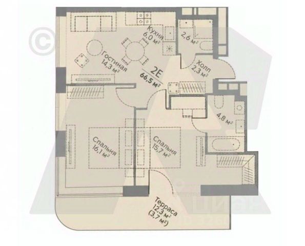 Общая площадь: 54 м²