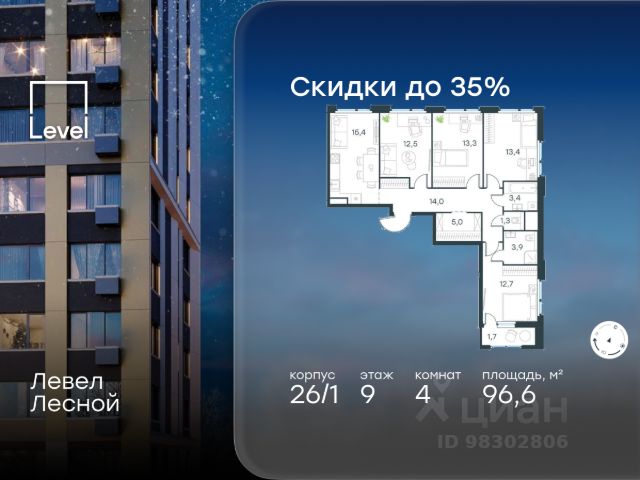 Цена указана с учётом скидки при 100%-й оплате, несубсидированной ипотеке, рассрочке (кроме программы "Рассрочка 0%"). В районе, утопающем в густой зелени лесов, многочисленных парков и скверов, продаётся 3-комнатная квартира площадью 87.10 кв.м с отделкой white box. Квартира расположена на 9 этаже в жилом комплексе комфорт-класса Левел Лесной (компания Level Group/Левел групп). Отличная транспортная доступность: - 25 мин. пешком до станции метро "Пятницкое шоссе"; - 28 мин. на автобусе до станции метро и МЦД-2 "Волоколамская"; - 11 мин. на авто до МКАД; - 25 мин. на авто до ТТК. Продуманный архитектурный проект: - Концепция проекта Левел Лесной от бюро СПИЧ; - Высотность комплекса до 15 этажей с уникальными видами на лесные массивы и город; - Высота потолков до 3 м; - Современные окна высотой до 1,6 м, в части квартир предусмотрены окна в пол. Высота подоконников 0,6 м; Расположение: Левел Лесной строится в зелёной зоне ближайшего Подмосковья, г.о. Красногорск в посёлке Отрадное. Шаговая и автомобильная доступность до метро и больших транспортных артерий города. За 25 минут вы дойдёте до станции метро "Пятницкое шоссе", а за 20 минут на машине сможете доехать до станции метро "Тушинская". Район окружен роскошной зеленью лесов и парковых зон, занимающих территорию свыше 1 000 гектаров. Помимо благоприятной экологии, здесь множество возможностей для активного отдыха и поддержания физической формы. Облагороженная территории с полностью развитой инфраструктурой. На территории проекта находится детский сад и школа "Светлые Горы", которая входит в список лучших частных школ от Forbes Education (по данным на 2023г.). Кроме того, в пешей доступности расположено ещё 8 детских садов, а также запланировано открытие современной муниципальной школы. В непосредственной близости находятся сетевые супермаркеты и локальные магазины, аптеки, клиники, почта, библиотека, салоны красоты, рестораны, спортивные и творческие секции, развивающие детские центры. В 12 минутах пешком расположен торговый парк "Отрада" с продуктовым и строительным гипермаркетами, магазинами, кинотеатром и развлечениями для детей. Внутренняя инфраструктура: Мы знаем, как важно, чтобы магазины и сервисы были всегда рядом. В сданных корпусах Левел Лесной уже расположена полностью готовая развитая инфраструктура. На первых этажах корпуса 27 предусмотрено ещё 14 коммерческих помещений. Благоустройство: Продуманное пространство и аура приватного европейского городка рождают чувство лёгкости и расслабления у каждого, кто попадает на территорию проекта. Концепцию общественных площадок разработали в партнёрстве два архитектурных бюро: Highlight Architecture и SCAPE. В безопасных дворах без машин каждый обязательно найдёт себе место для вдохновения, отдыха и спорта.