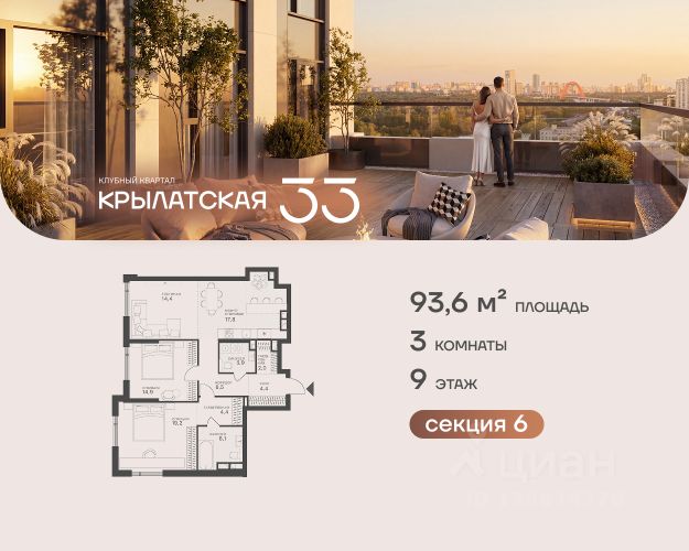 Продается студия площадью 30.3 кв.м. на 9-м этаже в ЖК "Клубный квартал Крылатская 33". Прямая продажа от застройщика! Крылатская 33 - проект премиум-класса на западе Москвы от специализированного застройщика "Сияние". Комплекс расположен всего в 15 минутах от Садового кольца и Москва-Сити, а рядом есть большое количество зелёных зон: Крылатский и Москворецкий парки, Серебряный бор, Крылатские холмы - это создает идеальный баланс между приватностью и динамичным ритмом мегаполиса. Квартал сочетает высотные башни до 150 метров и камерные малоэтажные корпуса. Витражное остекление "в пол" наполняет квартиры светом и открывает захватывающие панорамы на Москву-реку и знаковые виды столицы. Здесь каждый найдет то, что подходит именно ему - от уютных студий до роскошных пентхаусов и квартир с собственными террасами. Внутренняя среда жилого комплекса продумана до мельчайших деталей, чтобы резиденты могли продуктивно работать и качественно отдыхать, не покидая территорию: • фитнес-центр, включающий в себя СПА-зону; • коворкинг с кофейней и быстрым интернетом; • общественная гостиная для организации клубных мероприятий; • ресторан с панорамным остеклением; • благоустроенный сад с зоной отдыха; • инновационная игровая площадка для детей всех возрастов; • консьерж-сервис 24/7, современные системы видеонаблюдения и пожаротушения; • двухуровневый паркинг и многое другое. Район Крылатское - точка притяжения для тех, кто выбирает активный образ жизни. В непосредственной близости расположены Гребной канал, Олимпийский велотрек, горнолыжный комплекс "Лата Трэк", гольф-клуб и парковые зоны. В проекте действуют привлекательные условия покупки: - выгода до 10% при 100% оплате (действует на ограниченный пул квартир, подробности уточняйте в отделе продаж). - рассрочка от застройщика 0% с первоначальным взносом от 20% на срок до 30.06.2027.