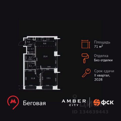 УСПЕЙ ПО СЕМЕЙНОЙ ИПОТЕКЕ! Премиум со скидками до 35%! Прямая продажа от застройщика! Жилой Комплекс премиум-класса. Продаётся 3-к квартира номер 728 общей площадью 71 кв.м. на 9-м этаже 57 этажного здания. Без отделки. Цена с учётом скидки. Особенности квартиры: - Угловая планировка - больше пространства для ваших идей. - Увеличенная ширина окна/окон - больше света и визуального простора. - Увеличенное количество окон - дополнительное освещение и свежий воздух. - Нестандартное окно - особенный акцент в вашем интерьере. - Увеличенная высота окна - больше воздуха и света. - Панорамное окно - создайте атмосферу открытости и простора. - Гостевой санузел - комфорт и удобство для ваших гостей. - Постирочная - организуйте пространство для стирки и сушки вещей. - Евроформат - просторное и удобное жилье с отличной планировкой. - Гибкая планировка - создайте пространство по своему вкусу. - Место для игры/занятия спортом - идеальное пространство для активных детей. - Можно оборудовать рабочее место - комфорт для работы и учёбы. - Просторная мягкая зона - комфорт и уют для отдыха всей семьи. - Линейная кухня - функциональность и практичность в одном решении. - Проходная кухня-гостиная - идеальное пространство для общения и готовки. - Ниша под шкаф - компактное и удобное место для вещей. Информация о комплексе: Amber City - это не просто квартал. Это место, куда ведут все маршруты, где рождается вдохновение работать и творить, где счастлива семья и жизнь кипит 24/7. Модная архитектура, высокотехнологичные решения и самодостаточная инфраструктура приближают Amber City к лучшим районам Гонконга и Нью-Йорка. Потрясающие виды на Москва-Сити и центр позволяют заряжаться их амбициозностью, не подчиняясь суете. Стремящиеся ввысь небоскребы, благоустроенный парк с зонами отдыха для взрослых и детей, а также многочисленные объекты инфраструктуры возводятся в западной части центра Москвы. Транспортная доступность: Квартал отличается исключительной транспортной доступностью: большая часть значимых мест Москвы находится на расстоянии 15-20 минут. Такое расположение позволит полностью погрузиться в деловую и культурную жизнь столицы и тратить на дорогу только необходимый минимум времени. Общественный транспорт: - Станция метро "Беговая" - 5 минут пешком - Станция "Беговая" (МЦД-1) - 5 минут пешком - Ж/д станция Беговая - 12 минут пешком - Остановка "2-й Хорошёвский проезд" - 3 минуты пешком - Станция метро "Звенигородская" (строящаяся) - 10 минут пешком На автомобиле: - Звенигородское шоссе - 3 минуты - TTK - 5 минут - Хорошёвское шоссе - 9 минут - Садовое кольцо - 12 минут - Красная Пресня - 15 минут - Тверская - 20 минут - Серебряный бор - 8 минут - Строгинский затон - 8 минут - Москва-Сити - 10 минут - Кремль - 20 минут - Аэропорт Шереметьево - 40 минут Внутренняя инфраструктура: Умелая работа над ландшафтом позволила правильно зонировать многоуровневое пространство, общей площадью 6 гектаров, открывая разнооб