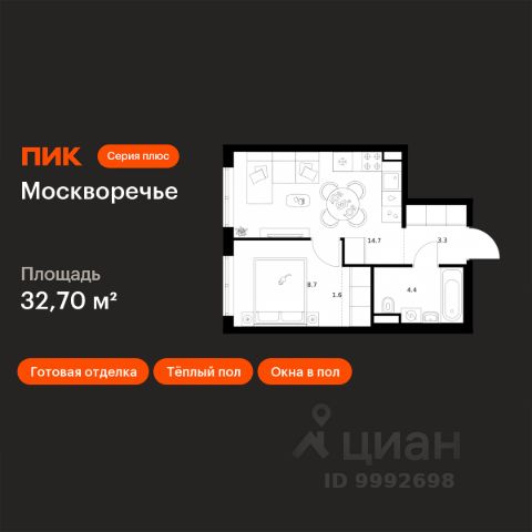Продается 1-комнатная квартира общей площадью 34.8 кв. метров на 9 этаже жилого комплекса ВЕЙВ. Комплекс располагается на юге Москвы в районе Москворечье-Сабурово. В пешей доступности расположены станция МЦД "Москворечье" и станция метро "Борисово". Для автомобилистов есть удобное сообщение с Каширским шоссе. Вторая очередь ВЕЙВ представляет собой архитектурный ансамбль из семи корпусов переменной этажности, объединенных общим стилобатом, в котором расположатся различные объекты инфраструктуры. Со стороны улицы Борисовские Пруды ВЕЙВ предстает тремя стометровыми башнями, выполненными футуристичными каскадами из стекла и металла. С противоположной стороны — три невысоких здания с непохожими друг на друга фасадами, придающими комплексу свой характер и уникальность. Ключевым преимуществом ВЕЙВ является благоустроенная набережная со смотровой площадкой, беговыми и велодорожками, детскими и спортивными. В центре квартала появится зеленый пешеходный бульвар с детскими и спортивными площадками, а также зоной тихого отдыха. Вокруг жилого квартала сосредоточены более 2000 га зеленых пространств: парк "Борисовские пруды", Братеевский каскадный парк, парк 850-летия г. Москвы, музеи-заповедники "Царицыно" и "Коломенское". Особое внимание в ВЕЙВ уделено интерьерам лобби, выполненным в современном стиле с контрастными акцентами. Стильное пространство разделено на несколько зон: ресепшен, зона ожидания с Wi-Fi и мягкими креслами, колясочная и лаконичный лифтовый холл. Для автомобилистов предусмотрен подземный паркинг с видеонаблюдением, зоной с оборудованием для подкачки колес, усилителем сотовой связи и системой распознавания номеров.