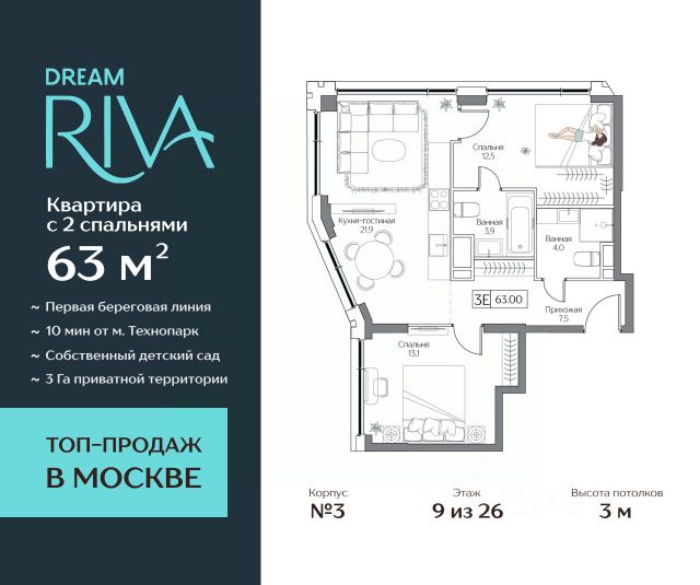 Увеличенный объем панорамного остекления создает неповторимое ощущения воздушности пространства! Двор-набережная с видами на гладь реки и кроны деревьев. Премиальный квартал DREAM RIVA — авторская архитектура в курортной концепции, воплощающей силу природных стихий в каждой детали оформления и благоустройства. Продаётся Квартира с 2 спальнями квартира на 9 этаже 26-этажного дома (3 корпус). Общая площадь: 63 кв.м. Высота потолков от 3 м. Формат приватного досуга и эксклюзивные привилегии в DREAM RIVA с приоритетным доступом для резидентов: - Первая линия Москвы-реки с открытыми видами на воду и город; - 3 Га приватного прибрежного парка с зонами для спорта и йоги; - Открытый солярий; - Школа и собственный детский сад; - Многофункциональные детские игровые площадки и детское кафе с игровой комнатой; - Клубная гостиная и lounge-бар. Локация вне конкуренции — инфраструктура полуострова предлагает всё, что нужно для размеренной жизни, работы, отдыха и развлечений: - Благоустроенная набережная с гастрогалереей; - Парк аттракционов Остров Мечты (в торговой части: рестораны, кафе, супермаркет, магазины, салон красоты, йога-студия и многое другое); - 44 Га ландшафтных парков для прогулок, спорта, пикников; - Пляжный комплекс Dream Beach Club со множеством бассейнов, ресторанов, баров и развлечений для любого возраста; - Яхт-клуб; - Вейк-парк; - Кинотеатр под открытым небом и многое другое. Удобная транспортная доступность: - Центр рядом: 15 минут до Садового кольца на авто, 20 минут до Сити или Кремля; - В 5 минутах прогулочным шагом — станция метро "Технопарк"; - Южный речной вокзал. Наши менеджеры будут рады провести для Вас консультацию и подробнее рассказать о проекте. Успейте купить на лучших условиях!