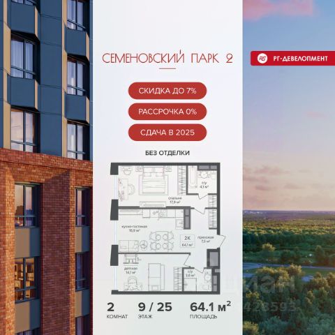 Ипотека для каждого! Полная стоимость кредита от 11,578% до 22,490%. Ставка от 0,11% в АО "Альфа-Банк" фиксируется на 1 год с даты заключения кредитного договора, далее полная стоимость кредита от 25,819% до 28,767% ставка 21,59% до окончания срока кредитования. Первоначальный взнос — от 20% от стоимости квартиры. Срок кредитования — от 3 до 30 лет. Ипотека на весь срок! Полная стоимость кредита от 23,396% до 26,058% со ставкой 14,5%! Первоначальный взнос —от 20,01% от стоимости квартиры. Срок кредитования — от 3 до 30 лет. АО "Банк ДОМ.РФ" универсальная лицензия Банка России 2312 от 19.12.2018. Скидка 7% при покупке квартиры! Цена указана с учетом максимального размера скидки. Продается 2-к квартира 102,1 кв.м. в ЖК "Семеновский парк 2" на 9-м этаже 18 этажного дома. Компания "РГ-Девелопмент" предоставляет скидки на квартиры в жилом комплексе. Акция действительна с 12.09.24 г. до 15.11.25г. включительно. Чтобы воспользоваться предложением, необходимо подписать договор на приобретение недвижимости до 15.11.25г., включительно. Скидка 5% + Рассрочка 0% При приобретении дольщиком квартиры с использованием способа оплаты "Рассрочка 0%", у покупателя также есть право воспользоваться скидкой в размере 5% от полной стоимости квартиры. Условия программы рассрочки: - Первый платеж составляет 20% от стоимости объекта и вносится при заключении ДДУ. - Оставшаяся сумма выплачивается за месяц до планового срока ввода ЖК в эксплуатацию, то есть не позднее 30.11.2025. Прямая продажа от застройщика! Квартиры без отделки. Срок сдачи корпуса - 4 кв. 2025 г. ЖК "Семеновский парк 2" - это идеальное место для того, чтобы стать вашим домом. Проект расположен в исторической части Москвы вблизи Измайловского лесопарка, в 1 км от ЦАО. 4 станции метро отделяют вас от Красной площади и 15 минут на автомобиле - от Садового кольца.