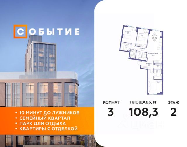 В продаже 1-к квартира от застройщика. Общая площадь 45.70, жилая 16.60, кухня 18.2. Квартира расположена на 13 этаже жилого квартала "Событие-6", корпус 1, Секция 1. Квартира без отделки. Срок сдачи: 4 кв. 2029 года. СОБЫТИЕ.6 — финальный дом парк-квартала СОБЫТИЕ на Мосфильмовской. Переезжайте в уже сформированный квартал с готовой инфраструктурой и парком! Премиальный жилой комплекс в престижном районе Москвы предлагает стильную архитектуру, продуманное благоустройство и великолепно разнообразие общественных пространств. Свой парк прямо возле дома! Архитектура Архитектура СОБЫТИЯ.6 выполнена в ультрасовременном стиле московским бюро Atrium на основе дизайн-кода британских архитекторов LDA Design и UHA London. Дом отличает оригинальная геометрия фасадов, большое остекление и высокие лобби (до 6,2 м) с авторской мебелью и светильниками. Расположение Мосфильмовская улица (Раменки) — один из престижных районов Москвы. Близость к историческому и деловому центру, природным зонам Запада столицы. Транспортная доступность: • 10 мин до Москва-Сити и ТТК; • 15 мин до Садового кольца; • 25 мин до аэропорта Внуково; • 7-10 мин до станций метро "Аминьевская" и "Мичуринский проспект". Инфраструктура: • парк "Событие" (12 га, финалист конкурса Правительства Москвы) с беговыми (1,5 км) и велодорожками (2,7 км), экотропой (1,6 км), площадками, лекторием; • школа, детский сад, магазины, салоны красоты, рестораны (к моменту заселения); • мультидвор с игровыми и спортивными площадками, мини-бульваром; • общественная терраса на 10-м этаже (коворкинг, лаунж); • Закрытые общественные пространства: детская комната, спортивный зал, коворкинг, лаунж-зоны. Паркинг 256 мест для жителей (48 — для электромобилей), 24 гостевых (5 — для электромобилей), мойки колес, кладовые, зоны для велосипедов. Окружение Парки и заповедники (Воробьёвы горы, Матвеевский лес и др.), МГУ, театр им. Н. И. Сац, стадион "Лужники". Безопасность Видеонаблюдение, контроль доступа, видеодомофоны, консьерж-сервис 24/7, системы пожарной безопасности и мультисервисная оптическая сеть.
