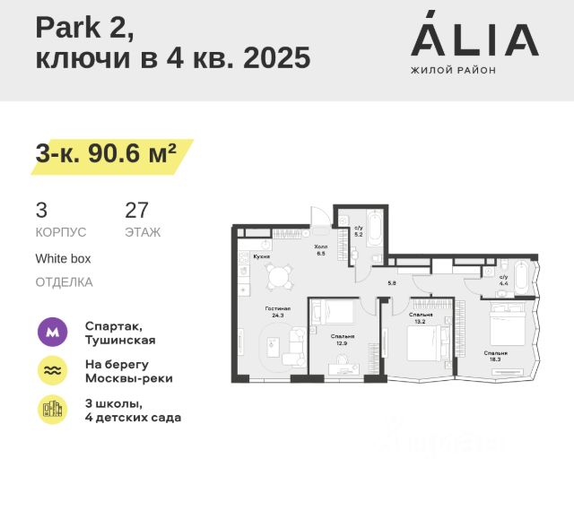 Продаётся 3-комнатная квартира 74.7 м². В жилом районе Алиа на 26-м этаже 28-этажного дома. Жилой район Алиа — это дома бизнес-класса у слияния Москвы-реки и Сходни. Алиа находится в Покровском-Стрешневе, экологически чистом районе на престижном северо-западе столицы. Район возводится на бывшей территории Тушинского аэрополя, где никогда не было промышленного производства. Алиа — это район разностороннего развития, спроектированный по принципу WORK.LIVE.PLAY.LEARN. Это "15-минутный город", где вся необходимая для комфортной жизни инфраструктура — на расстоянии приятной прогулки. У района удобное расположение: отсюда меньше 10 минут пешком до станций метро "Спартак" и "Тушинская" и всего полчаса на автомобиле до центра города или аэропорта Шереметьево. Архитектурную концепцию Алиа разработало бюро SOM (Skidmore, Owings & Merrill), авторы знаменитой "Бурдж-Халифа". В Алиа больше 140 планировочных решений, среди которых — редкие для Москвы форматы: квартиры с окном в ванной, пентхаус, сити-юниты и таунхаусы. Почти половина территории района отдана под благоустройство. В Алиа три парка: Линейный парк с кафе и магазинами, Центральный парк с амфитеатром, сухим фонтаном и большим плейхабом для детей всех возрастов и Прибрежный парк на собственной набережной, одной из самых длинных в Москве. В каждом урбан-блоке — закрытый внутренний двор с гипоаллергенными растениями и детской площадкой. В лобби каждого жилого корпуса в Алиа оборудована зона ожидания, колясочная, гостевой санузел и лапомойка для домашних животных. За стойкой ресепшена резидентов и их гостей встречает консьерж. Центральное лобби урбан-блока — это стильное общественное пространство с коворкингом, лаундж-зоной и кофе-пойнтом. Это "вторая гостиная" жителей урбан-блока и одно из мест, где формируется комьюнити Алиа. Два ключевых объекта инфраструктуры в Алиа — это спорткомплекс "Чкалов Арена", где представлены 25 видов спорта, и самый большой в стране бизнес-парк класса A, благодаря которому району обеспечено быстрое развитие. Продам квартиру в ипотеку в районе Покровское-Стрешнево в Москве.