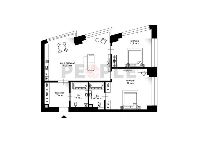 Планировка квартиры: просторная кухня-гостиная, мастер-cпальня с гардеробной и совмещенный с/у, гостевая спальня с гардеробной, совмещенный с/у, кабинет, гостевой с/у, постирочная, гардеробная и просторный холл.