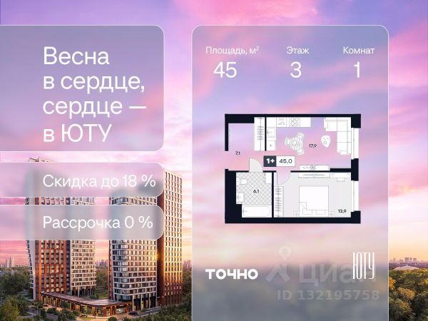 Скидка до 18% в апреле на выделенный пул лотов! ЮТУ — камерный проект бизнес-класса с исключительной архитектурой, видовыми квартирами и подходом к большой благоустроенной набережной канала имени Москвы. Проект создает идеальный баланс жизни в городе. Это приватный оазис, где в любой момент можно сменить обстановку и выбрать любой из тысячи маршрутов к активному отдыху и ярким впечатлениям. Удачное месторасположение: • Первая линия в прибрежной части Химкинского водохранилища • Исключительно тихий и зелёный район Южное Тушино • За 2 минуты можно спуститься к воде, за 10 минут найти зеленые парки и готовую инфраструктуру, за 30 минут доехать до Кремля Концепция проекта: • Две футуристичные башни, соединенные торговой галереей от бюро ATRIUM • 60 неповторяющихся планировок: квартиры с угловым панорамным остеклением, мастер-спальнями и гостиными до 39м², а также просторные квартиры площадью до 128,6 м² Чувство эксклюзивности: • Своя приватная жилая экосистема только для резидентов домов • Лаунж-терраса на крыше • В проекте предусмотрен закрытый двор-парк. Прогрессивные технологии: • 3-х уровневая система безопасности (Face ID, BLE-метки, видеонаблюдение) • Умный паркинг с распознаванием номеров Проект федерального девелопера ТОЧНО, который входит в ТОП-5 девелоперов России по объемам строительства.