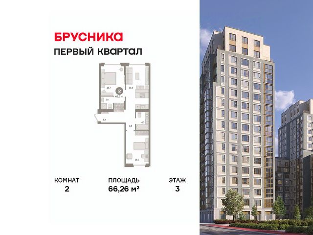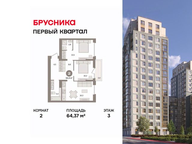 Квартира с кухней-гостиной и двумя спальнями в "Первом квартале". Особенности планировки: вид во двор, второй санузел, лоджия, мастер-спальня, окна на две стороны, предчистовая отделка, разнесённые спальни, терраса. квартиры в нашей базе: МТК03-Ж4.10.6.