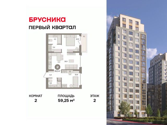 Квартира с кухней-гостиной и двумя спальнями в "Первом квартале". Особенности планировки: балкон, вид во двор, гардеробная, мастер-спальня, предчистовая отделка. квартиры в нашей базе: МТК02-Ж2.3.2.
