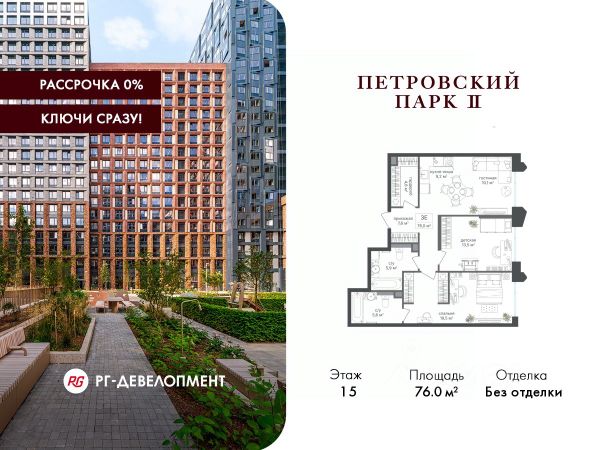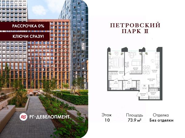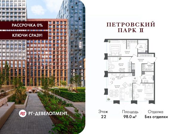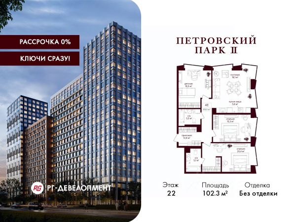 Рассрочка 0%. Первый платёж 30%, второй - не позднее 31.12.2026 г. Продаётся 3-комнатная квартира 102.3 кв.м. в ЖК "Петровский парк II" на 22-м этаже 25 этажного дома. ЖК "Петровский парк II" — жилой комплекс в Савёловском районе, где город ощущается иначе. Здесь история и масштаб Москвы не давят, а задают фон для спокойной, уверенной жизни рядом с центром. Это место, где статус читается не в громких формулировках, а в окружении, архитектуре и ощущении пространства. Коротко о важном: • Район с глубоким историческим контекстом и парковым окружением; • 5 минут пешком до метро "Динамо", рядом с деловой и культурной жизнью города; • Редкое сочетание: энергия мегаполиса и тишина зелёных аллей; • Архитектура от бюро Синтаксис с пластикой форм и индивидуальным характером фасадов; • Панорамные виды на город и зелёные массивы Петровского и Тимирязевского парков; • Закрытый двор без машин, вдохновлённый эстетикой дворцовых садов; • Просторные входные группы с высокими потолками и выверенной, респектабельной эстетикой; • Частный детский сад во дворе; • Подземная парковка и кладовые; • РГ-Девелопмент - ТОП-20 крупнейших застройщиков Москвы. Расположение комплекса формирует особое ощущение свободы выбора. Утром - прогулка по тенистым аллеям Петровского парка, днём - работа и встречи в деловых кластерах поблизости, вечером - культурные события, рестораны и городские пространства в нескольких минутах пути. Здесь расстояния измеряются не километрами, а шагами от дома. Архитектура "Петровского парка II" задумана как современный архитектурный акцент района и одновременно как уважительный диалог с исторической средой. Асимметричные объёмы, волнообразные элементы и игра света и тени создают выразительный, но сдержанный силуэт. Архитектура наполнена воздухом и визуальным ритмом, оставаясь спокойной и уверенной. Общественные пространства продолжают эту логику. Два парадных вестибюля с высокими потолками и благородной цветовой палитрой воспринимаются как пространства, где хочется замедлиться: встретить гостей, перевести дыхание после дня или просто почувствовать уровень среды, в которой вы живёте. Внутренний двор комплекса - это отдельный мир, закрытый от машин и городского шума. Продуманное благоустройство территорий отсылает к регулярным дворцовым садам: геометрия аллей, зелёные "кабинеты", цветники и камерные зоны отдыха создают разные сценарии для повседневной жизни. Здесь органично соседствуют детские игровые пространства, спортивные зоны и тихие места для отдыха. На территории комплекса расположены магазины, кафе и рестораны, а также частный детский сад, встроенный в общую структуру двора. Подземная парковка и кладовые поддерживают ощущение порядка и цельности пространства.
