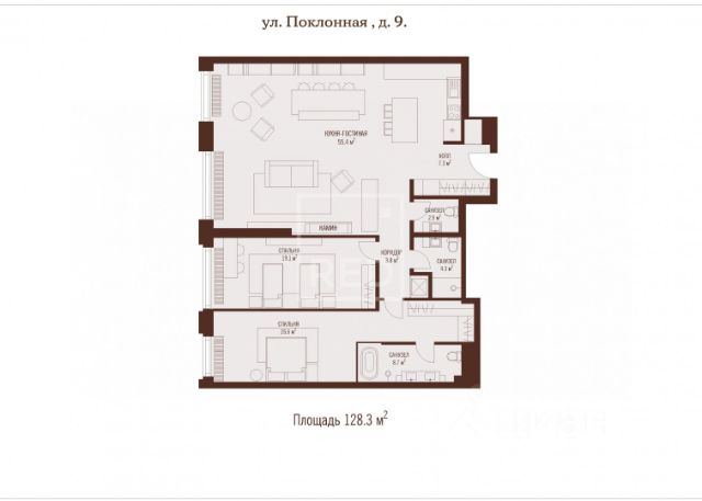 Квартира с двумя спальнями 116,8 м² и террасой 89,8 м² общей площадью 143,8 м² (терраса учтена с понижающим коэффициентом 0,3 ) в комплексе премиум-класса Victory Park Residences рядом с Парком Победы. Квартира с готовой дизайнерской отделкой от застройщика в стиле "неофактура" расположена на первом этаже в корпусе 4. Окна выходят на две стороны, с видом в Victory Garden.