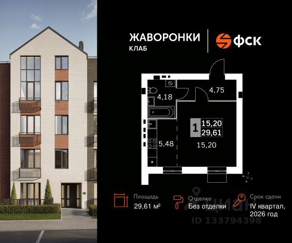 Прямая продажа от застройщика! Загородный жилой комплекс класса Комфорт Плюс. Продаётся 1-к квартира 113 общей площадью 28.87 кв.м на 2-м этаже 4 этажного дома. Без отделки. Расположение комплекса: Для создания гармоничного пространства в проекте собрана вся необходимая инфраструктура, начиная от закрытых дворов с детскими площадками и зонами отдыха, тренажерного спортивного зала с мини-саунами и детской комнаты, до благоустроенной набережной, где разместится большой игровой хаб с прогулочным маршрутом и зоной барбекю. Благоприятная роза ветров и отсутствие производств влияют на качество воздуха. Вода и природа успокаивают и заряжают энергией. В жилом комплексе "Жаворонки Клаб" создана современная образовательная среда с полным циклом обучения от детского сада до старших классов. Школа 560 мест с инновационным оснащением. Детский сад 260 мест. Все образовательные учреждения будут муниципальными и записаться в них сможет каждый маленький житель комплекса. Дорога до школы или детского сада займет не более 5 минут. Ваш ребенок поспит подольше и не опоздает к первому уроку! Здесь также будет расположена муниципальная поликлиника, административно-бытовой комплекс, магазины и кафе. Транспортная доступность: В 30 м от территории ЖК находятся остановки общественного транспорта, откуда можно добраться до ближайших железнодорожных станций Санино (5 мин.), Крёкшино (7 мин.) и Жаворонки (7 мин.), а в 10 минутах - остановки маршрутов, идущих до станций метро Саларьево и Парк Победы. Съезд на Минское шоссе расположен в 700 м от ЖК. Внутренняя инфраструктура: В рамках проекта будут построены муниципальные детский сад и общеобразовательная школа, административно-бытовой комплекс (магазины формата "у дома", точки бытовых услуг, street-retail, кафе, кофейня, аптека, а также многофункциональный торгово-развлекательный центр с ФОК и амбулаторией. Для удобства и комфорта жителей, когда все "под рукой" мы разместили в ЖК бесплатный тренажерный зал с раздевалками и мини-саунами. Сюда можно приходить самостоятельно или с личным тренером для функциональной тренировки. Для детей обустроена игровая с множеством развивающих сюжетных игр, а также различные "лазалки". Эта детская комната также подойдет для празднования дня рождения ребенка.