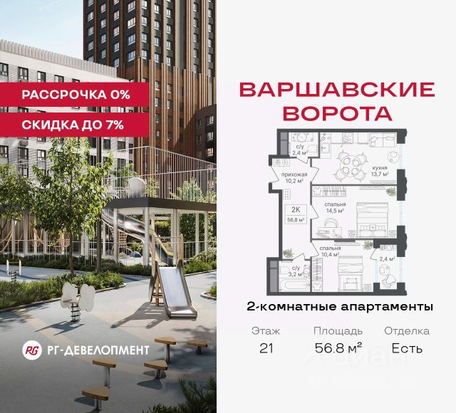 Продаются 2-комнатные апартаменты 56.3 кв.м. в МФК "Варшавские ворота" на 8-м этаже 30 этажного дома. МФК "Варшавские ворота" — это точка баланса между природой и городом, стилем и функциональностью, жизнью сегодня и устойчивым будущим. Коротко о важном: - 1 минута пешком от м. Аннино; - Удобные выезды на Варшавское шоссе и МКАД; - Высота потолков 2,7 - 3 м; - Закрытый двор-парк; - Школы и детские сады в 10-15 минутах пешком от дома; - Технические лоджии для размещения кондиционеров; - Подземный паркинг; - РГ-Девелопмент — ТОП-20 крупнейших застройщиков Москвы. Проект сочетает в себе современную архитектуру и продуманное благоустройство с уникальным природным окружением. Всего в нескольких минутах от дома — девять парков, каскад прудов и крупнейшие лесопарковые зоны Москвы, создающие ощущение жизни в зеленом оазисе посреди мегаполиса. Архитектурная концепция - стиль Чикаго в Москве. Фасады облицованы вентфасадами под клинкерную плитку. Фасады подчеркивают строгие линии и современный стиль, а входные группы разработаны московским бюро Синтаксис. Вестибюли оформлены с применением керамогранита, декоративной штукатурки и гипсовых панелей, детали из латуни добавляют изысканности. Проект находится в 1 минуте пешком от метро "Аннино", в 12 минутах от станции "Улица Академика Янгеля" и рядом с МЦД-2 "Красный Строитель". Для автомобилистов предусмотрен прямой выезд на Варшавское шоссе и два съезда на МКАД, что позволяет быстро добираться в любую часть города. Среди планировочных решений представлены разнообразные форматы: от функциональных студий до просторных 4-комнатных квартир и апартаментов. Высокие потолки усиливают ощущение простора, а продуманные планировки включают мастер-спальни, гардеробные, объединённые кухни-гостиные и несколько санузлов. Центральное пространство комплекса — закрытый двор без машин. Он разделён на функциональные зоны: детские игровые комплексы, спортивные площадки и уютные места для тихого отдыха. На первых этажах разместятся магазины, кафе и сервисы, что позволит решать повседневные задачи, не покидая территорию комплекса. Для семей с детьми предусмотрен частный детский сад на 50 мест. Подземная парковка и кладовые обеспечат удобство хранения и безопасность автомобилей. Комплекс окружён девятью парками и лесопарками, каждый из которых обладает своей атмосферой. Выйти на пробежку в Аннинском лесопарке, насладиться прогулками по аллеям в Битцевском лесу, спланировать пикник или велопрогулку в Покровском парке, любоваться каскадом Кировоградских прудов. Всего в двух станциях — музей-заповедник "Царицыно" с дворцами, фонтанами и живописными пейзажами. Здесь каждый житель найдёт своё любимое место для отдыха. Южное Чертаново - район развитой инфраструктурой, где сочетаются городские удобства и природное окружение. В шаговой доступности находятся школы, детские сады, спортивные комплексы и торговые центры. Это спокойный и благоустроенный район.