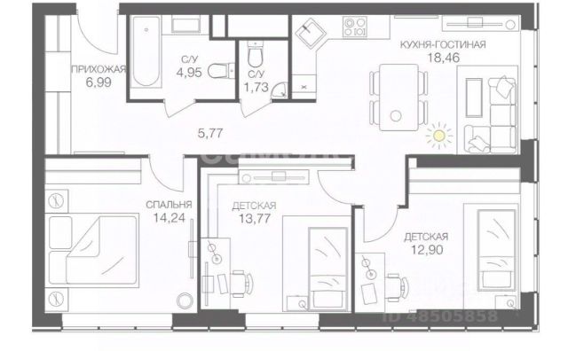 Код объекта: 1843121. Просторная трехкомнатная квартира 75,64 кв.м. Отлично подойдет для большой семьи и для тех, кому важно пространство и уют. В большой кухне-гостиной будет удобно собираться за приемом пищи, играми или просмотром телевизора. Одну комнату удобно обустроить для хозяев, вторую - под детскую, гостевую или кабинет. — Общая площадь — 75,64 кв.м., этаж 7/8 — Современная планировка — просторные комнаты, функциональная кухня, удобное зонирование — Высокие потолки — ощущение простора и света — Большие окна: в квартире всегда будет светло — Квартира без отделки: вы можете сделать такой ремонт, какой хотите именно вы — Удобное расположение — в престижном ЖК бизнес-класса Headliner в Пресненском районе, ЦАО — Вид из окна позволит наслаждаться красивыми рассветами и закатами — Тихий двор — квартира выходит на закрытую благоустроенную территорию — Метро Шелепиха в 5 минутах ходьбы — Удобная дорожная развязка ЖК бизнес-класса Headliner современный проект из 10 кирпично-монолитных домов, разработанный по авторскому проекту известного московского бюро Остроженка. В каждом подъезде: — консьерж — индивидуальные кладовые для малогабаритного имущества — тихие скоростные лифты с интеллектуальным управлением + грузовой лифт — цифровая электронно-пропускная система На первых этажах ЖК расположились магазины, фитнес-клуб, заведения общепита. В стилобате детский сад на 130 мест и частная школа Путь к успеху с индивидуальным подходом в обучении. Все придомовые территории благоустроены и озеленены: прогулочные зоны, велодорожки, игровые площадки и уличные гимнастические комплексы. Есть подземный паркинг на 2200 мест. В пешей доступности: — медицинские и дошкольные учреждения — школы, гимназии, филиалы ВУЗов — сетевые супермаркеты и спортивные объекты — деловой центр Москва-Сити