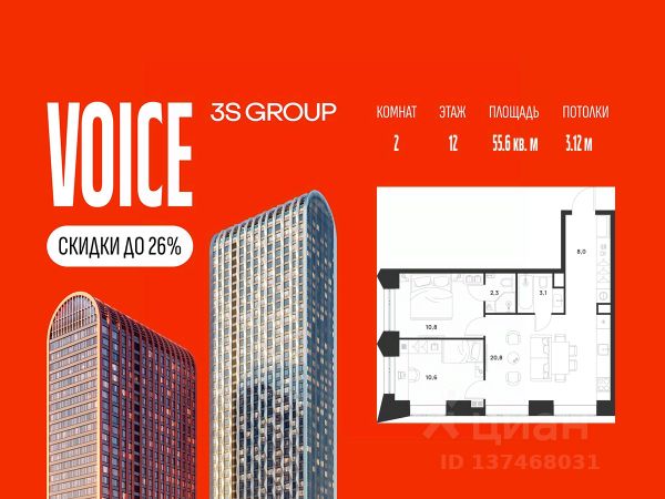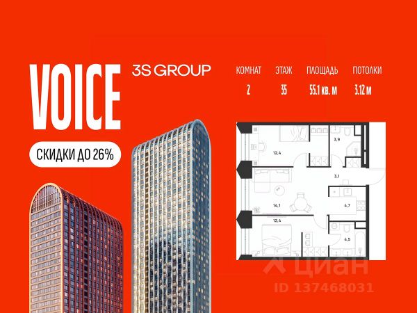 Ипотека от 3,5% на весь срок. Дополнительная скидка в офисе продаж! Продается уютная 2-комн. квартира площадью 50,1 кв.м на 5 этаже жилого комплекса бизнес-класса Voice Towers от 3S Group. Общая площадь: 50,1 кв.м., жилая: 35,3 кв.м., площадь кухни-гостиной: 19,6 кв.м., высокие потолки: 3,12 м., санузел совмещенный. О проекте: Voice. Высокие стандарты жизни Мы уверены, что высокие идеалы неизменно помогают достигать высот. Создавая Voice, мы ориентировались на людей с высокими требованиями к качеству и безупречным вкусом. Башни жилого комплекса, сочетают элегантную форму с динамичной геометрией фасадов, устремляются ввысь и отвечают самым высоким стандартам строительства. Технологичность, воплощенная в архитектуре - это ваш, собственный Voice. Преимущества локации Близость к метро Текстильщики, БКЛ и МЦК Новохохловская (10 мин) Рядом природный заповедник и конно-спортивная база Кузьминки-Люблино Будущее окружение Проект Южный порт - Текстильщики с деловым центром Сити-2 Небоскребы высотой до 300м Культурный центр с амфитеатром Променад вдоль Москвы-реки и яхт-клуб Архитектура Проект от Архитектурной мастерской Алексея Ильина Две перпендикулярные башни с арочными вершинами Высокая башня: светло-серый металл Низкая башня: терракотовая керамика Благоустройство Внешняя зона: парковки, магазины, кафе Внутренний двор: закрытая территория с озеленением Шумозащитный экран Сезонное озеленение Встречи на высоте Гранд-лобби высотой 8м Дизайнерская мебель Умные скоростные лифты Услуги Детский центр с игровой зоной Фитнес-студия для жителей