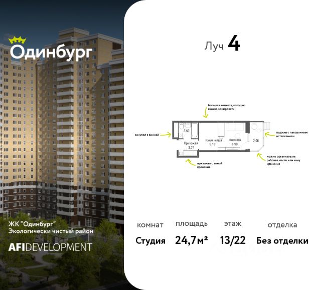 Продается квартира от надежного застройщика Tashir Estate в квартале бизнес-класса Stellar City в ЗАО Москвы. Площадь квартиры составляет: 28.7 кв. м, потолки: 3.1 м Квартира находится на 8 этаже, 4 корпуса жилого квартала Stellar City — микрогорода будущего на орбите Москвы. Stellar City — квартал в ЗАО Москвы вблизи инновационного центра Сколково. В окружении — 11 парков и природных зон, в том числе Долина реки Сетунь, Мещерский лес и парк развлечений The Rink. Город в городе Чтобы дом и инфраструктура вокруг отвечала динамичному лайфстайлу жителя мегаполиса, в основу проекта легла концепция город в городе, которая позволяет решать все бытовые вопросы in-home. В квартале будут возведены школа и детский сад, воркаут-зоны, променад, вело и беговые дорожки, детские площадки для каждого корпуса, а также коммерция на первых этажах для ежедневных покупок. Все необходимое — на расстоянии нескольких шагов. Изящные и лаконичные лобби Авторский дизайн, натуральные материалы в отделке и безупречный интерьер вне времени. Лобби и холлы в проекте бизнес-класса Stellar City ничем не отличаются от входных групп в премиум-сегменте благодаря качественным европейским материалам в отделке, стильному дизайну, консьерж-сервису и уютной зоне ожидания с журнальными столиками и мягкой мебелью. Комфорт и безопасность Закрытая территория, охрана, система СКУД, специально разработанное мобильное приложение дома для резидентов и подземный паркинг с круглосуточным наблюдением и доступом с помощью автоматического считывания номера авто.