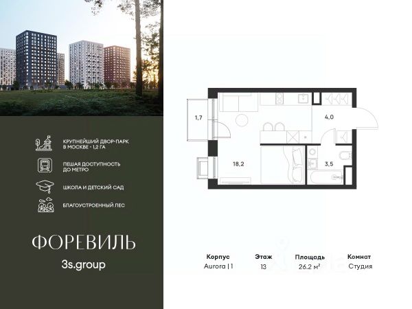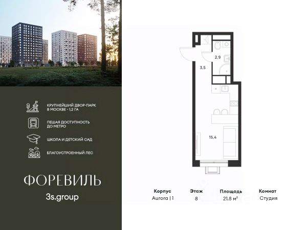 Пешая доступность от метро и московская прописка! Продается уютная студия площадью 24,7 кв.м на 15 этаже 17 этажного жилого комплекса бизнес-класса Foreville от 3S Group. Общая площадь: 24,7 кв.м., жилая: 12 кв.м., площадь кухни-гостиной: 6 кв.м., высота потолков: 3 м., окна выходят во двор. Квартира предлагается без отделки, что идеально подходит для воплощения собственного дизайнерского решения. Также доступна опция предчистовой отделки, стоимость которой включается в общую цену квартиры. О проекте: Пространство Комплекс располагает крупнейшим приватным двор-парком в Новой Москве площадью 1,2 Га, предлагая жителям огромное пространство для отдыха, спорта и игр на свежем воздухе. Природный ландшафт Внутренний лесопарк с более чем 183 взрослыми деревьями и 10 320 цветущими кустарниками создает уникальную природную атмосферу для каждого времени года. Игровые и спортивные зоны Обширные площадки с безопасным покрытием, специализированные зоны для детей разных возрастных групп и взрослых, включая воркаут и настольный теннис, способствуют активному и здоровому образу жизни. Экологичность и долговечность Использование натуральных материалов, таких как лиственница, и крупноформатной бетонной плитки для покрытия, подчеркивает стремление проекта к экологичности и устойчивости. Безопасность и уединение Внутренний двор без машин обеспечивает безопасность для детей и спокойствие для взрослых. Территория огорожена и находится под круглосуточным видеонаблюдением. Сохранение времени Благодаря превосходной транспортной доступности и близости к новой станции метро Корниловская, Foreville позволяет жителям экономить время для семьи и отдыха на природе, минимизируя необходимость длительных поездок. Foreville не просто жилье, а целая экосистема для комфортной и гармоничной жизни на свежем воздухе, совмещая преимущества городской инфраструктуры и непосредственную близость к природе.