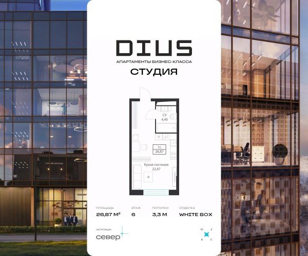 Сервисные апартаменты для жизни! Продаются апартаменты 26.87 кв.м. на 4-м этаже 20-этажного комплекса. Преимущества лота: - Панорамные окна - Вид на парк - Отделка White box - Потолки 3,3 м - Доступ к сервисам комплекса класса Премиум DIUS — многофункциональный комплекс бизнес-класса на севере Москвы, сочетающий сервисные апартаменты, бизнес-центр класса А и торгово-развлекательную галерею. Проект, воплощающий современный подход к жизни в мегаполисе, позволяет объединить комфорт проживания, работу, деловые встречи и досуг в едином пространстве. На территории DIUS предусмотрены двухуровневый подземный паркинг с прямым доступом из лифта, гостевые парковочные места, а также бизнес-центр и торгово-развлекательная галерея. Территория комплекса закрыта для посторонних и благоустроена с учётом современных стандартов: качественное озеленение, прогулочные дорожки, зоны тихого и активного отдыха. Закрытая территория, современные лобби, коворкинги, спортивные зоны и общественные пространства создают условия для жизни, работы и отдыха. Резиденты комплекса могут воспользоваться профессиональными сервисами управляющей компании, включая уборку, техническую поддержку, обеспечение безопасности и доверительное управление для инвесторов. DIUS расположен в районе с развитой инфраструктурой и высоким спросом на аренду. В шаговой доступности — станция МЦД-2 "Гражданская" (5 минут пешком) и станции метро "Аэропорт" (15 минут пешком) и "Сокол". Быстрый выезд на основные магистрали Москвы обеспечивает удобную транспортную доступность: дорога до центра занимает около 25 минут, до Белорусского и Савёловского вокзалов — 15 минут, до аэропорта Шереметьево — 45 минут. В окружении DIUS — Тимирязевский и Петровский парки, ландшафтный парк "Ходынское поле", культурные и исторические объекты столицы, а также крупнейшие торговые и спортивные центры города. Такое соседство открывает разнообразные возможности для отдыха, прогулок и насыщенного досуга. В DIUS реализован формат отделки White Box: каждые апартаменты предоставляется будущему владельцу в современном и подготовленном под чистовую отделку состоянии. Условия покупки: - 100% оплата с максимальной выгодой - Рассрочка на срок до 24 мес. под 0% от застройщика - Трейд-ин с полным сопровождением Мы предлагаем несколько форматов покупки, чтобы вы могли выбрать оптимальный сценарий — исходя из ваших целей, возможностей и финансовых стратегий. Наши менеджеры будут рады ответить на все ваши вопросы - звоните нам напрямую по номеру в объявлении.