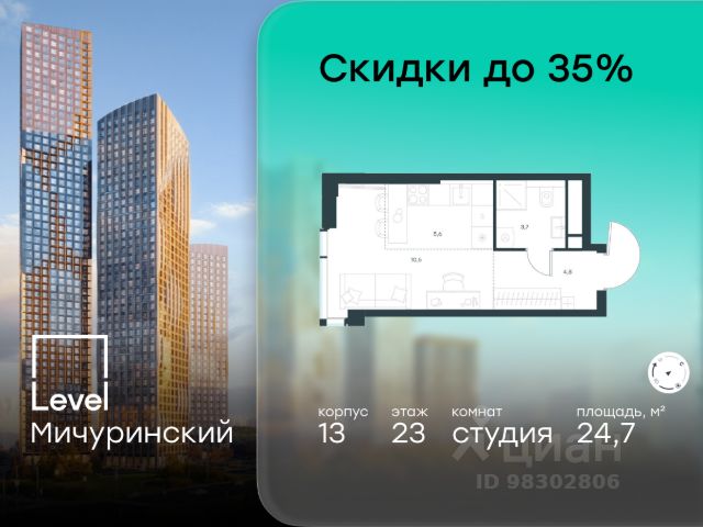 Цена указана с учётом скидки при 100%-й оплате, несубсидированной ипотеке, рассрочке (кроме программы "Рассрочка 0%"). В жилом квартале, расположенном на границе с природным заказником "Долина реки Очаковки", продаётся студия площадью 21.40 кв.м без отделки. Квартира расположена на 2 этаже 24-этажного корпуса 7 в жилом комплексе бизнес-класса Level Мичуринский (компания Level Group/Левел групп). Отличная транспортная доступность - 10 мин. пешком до станции метро "Мичуринский проспект" - 15 мин. пешком до станции метро "Аминьевская" - 7 мин. на авто до МКАД - 10 мин. на авто до ТТК - 15 мин. на авто до Москва-Сити Продуманный архитектурный проект - Выразительная архитектура от известных бюро: корпуса 1-6 - СПИЧ, корпуса 7-13 - Borisov Architects; - Из окон открываются живописные виды на парки, Москва-Сити и МГУ; - Высокие потолки до 6,35 м; - Стильные лобби с окнами в пол и высокими потолками до 4,7 м; - С каждого этажа дома на лифте можно спуститься в подземный отапливаемый паркинг. Расположение Level Мичуринский строится в одном из самых зеленых районов Москвы - Очаково-Матвеевское. Этот уголок столицы идеален для поддержания здорового образа жизни. В шаговой доступности от проекта находятся заказник "Долина реки Очаковки" - 1 мин. пешком и Очаковский парк - 7 мин. пешком. На велосипеде можно добраться до таких парков, как "Событие", парк Олимпийской деревни, парк 50-летия Октября и парк Школьников. В 15-минутной доступности на авто расположено более 30 детских садов (из них 14 в пешей доступности), 32 школы (из них 13 в пешей доступности) и 14 вузов. В ближайшем окружении работает более 25 медицинских учреждений, 11 спортивных клубов и 22 продуктовых супермаркета. Внутренняя инфраструктура На территории жилого комплекса строится три детских сада и школа. На первых этажах домов откроется супермаркет, фитнес-центр, ресторан, кафе и другие сервисы. Подземные этажи займут паркинги: трехуровневые в этапах 1 и 2, одноуровневый в этапах 3 и 4. Преимущества проекта - 4,5 га благоустроенной территории с видовым мостом, уличным кинотеатром, зонами для тихого отдыха, работы, воркаута, площадки для петанка, футбола, настольного тенниса и пляжного волейбола; - Дизайнерские лобби с панорамным видом на двор, мойками для лап животных и комфортными зонами ожидания. - Безопасность жителей: круглосуточное видеонаблюдение всех зон общего пользования (лобби, лифты, паркинги, детские площадки), система контроля доступа, управление видеодомофоном через мобильное приложение, единый ключ доступа на территорию жилого комплекса. - Технологии и комфорт: высокоскоростной Wi-Fi в лобби и на придомовой территории, автоматическая система контроля и учета ресурсов, абонентская связь с консьержем, распознавание номеров автомобилей при въезде/выезде в/из паркинга.