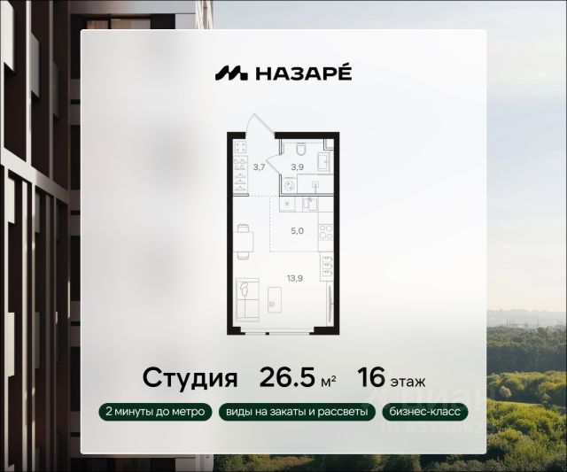 Продается студия в ЖК "НАЗАРЕ'" Общая площадь - 21.50 Тип дома - монолитный Этаж - 5 Год сдачи - 2028 Предлагается квартира площадью 21.50 кв. м в новом современном квартале на востоке Москвы, прямо у станций метро и МЦК "Бульвар Рокоссовского". Квартира располагается в корпусе 3 на 5 этаже комплекса бизнес-класса "НАЗАРЕ'". Великолепная транспортная доступность: • 2 минуты ходьбы до метро и МЦК "Бульвар Рокоссовского"; • 3 минуты на авто - удобный выезд на СВХ (МСД); • 10 минут на авто до национального парка "Лосиный остров"; • 10 минут на авто до "Измайловского парка"; • 15 минут до авто до парка "Сокольники"; • 15 минут занимает выезд на ТТК, • 18 минут на авто до Садового кольца. Индивидуальная архитектура в современном стиле: • шесть башен переменной высотности от 24 до 43 этажей, в том числе одна высотная 143-метровая доминанта, которая станет достопримечательностью востока Москвы; • авторы архитектурной концепции - знаменитое бюро СПИЧ (среди их работ - башня "Федерация", новое здание Третьяковской галереи, реконструкция БСА "Лужники" и др.); • торгово-развлекательный комплекс с фитнес-центром, детской игровой комнатой и открытыми террасами прямо возле квартала; • дизайнерские лобби от бюро ABOVE ARCHITECTURE с панорамными окнами, интерьерами в теплой цветовой гамме и мягкой зоной ожидания располагаются в каждой башне; • корпуса расположены так, чтобы из окон открывались потрясающие виды на закаты и рассветы, зеленые панорамы или огни мегаполиса; Особенности расположения "НАЗАРЕ'" находится максимально близко к метро, и в то же время проект вписан в уже существующую инфраструктуру зеленого столичного района Богородское. Это обеспечивает быстрый доступ ко всем нужным объектам инфраструктуры (детские сады, школы, медцентры, магазины, салоны красоты, фитнес-клубы, футбольные поля, спортивные школы), а также к живописным зеленым зонам - национальному парку "Лосиный остров", парку "Сокольники", Черкизовскому детскому парку, Измайловскому лесопарку с усадьбой Измайлово. Собственная инфраструктура и благоустройство Шесть башен квартала будут объединены цокольным этажом, в который можно попасть как с улицы, так и со стороны лобби. Здесь разместятся необходимые для комфортной повседневной жизни кофейни, супермаркет, рестораны, магазины и многое другое. В комплексе предусмотрен вместительный двухуровневый подземный паркинг с келлерами для хранения сезонных вещей. Во дворе комплекса "НАЗАРЕ'" будут места как для спокойного отдыха и работы, так и для игр и спорта. Здесь организованы игровые площадки для детей всех возврастов, места для стритбола и тенниса, а также зона с природным ландшафтом и коворкинг с экологичной деревянной мебелью.