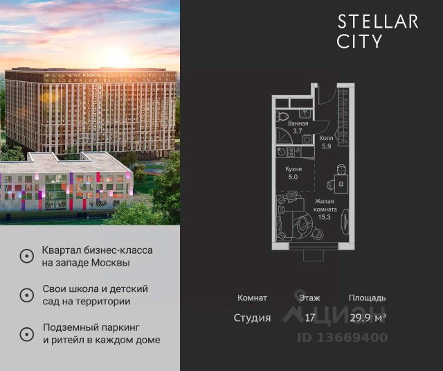 Продается квартира от надежного застройщика Tashir Estate в квартале бизнес-класса Stellar City в ЗАО Москвы. Площадь квартиры составляет: 29.3 кв. м, потолки: 3.1 м Квартира находится на 11 этаже, 4 корпуса жилого квартала Stellar City — микрогорода будущего на орбите Москвы. Stellar City — квартал в ЗАО Москвы вблизи инновационного центра Сколково. В окружении — 11 парков и природных зон, в том числе Долина реки Сетунь, Мещерский лес и парк развлечений The Rink. Город в городе Чтобы дом и инфраструктура вокруг отвечала динамичному лайфстайлу жителя мегаполиса, в основу проекта легла концепция город в городе, которая позволяет решать все бытовые вопросы in-home. В квартале будут возведены школа и детский сад, воркаут-зоны, променад, вело и беговые дорожки, детские площадки для каждого корпуса, а также коммерция на первых этажах для ежедневных покупок. Все необходимое — на расстоянии нескольких шагов. Изящные и лаконичные лобби Авторский дизайн, натуральные материалы в отделке и безупречный интерьер вне времени. Лобби и холлы в проекте бизнес-класса Stellar City ничем не отличаются от входных групп в премиум-сегменте благодаря качественным европейским материалам в отделке, стильному дизайну, консьерж-сервису и уютной зоне ожидания с журнальными столиками и мягкой мебелью. Комфорт и безопасность Закрытая территория, охрана, система СКУД, специально разработанное мобильное приложение дома для резидентов и подземный паркинг с круглосуточным наблюдением и доступом с помощью автоматического считывания номера авто.