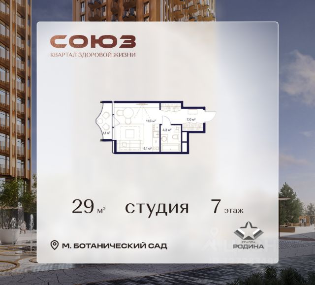 Рассрочка 0% Продаётся квартира-студия площадью 27.4 м² на 2 этаже в Жилом Комплексе "Союз". Квартал здоровой жизни премиум-класса с рекордным количеством олимпийских видов спорта: - Ледовая арена для хоккея и фигурного катания, - Футбольные поля для тренировок, - Спортивный зал для фехтования, - Бассейн на 6 дорожек, - Центр единоборств, - 4 крытых площадки для настольного тенниса, - 7 теннисных кортов (крытых и открытых), - 4 крытых площадки для сквоша, - Легкоатлетический стадион, - Площадки для баскетбола и волейбола. Уникальные форматы квартир с мастер-спальнями, приватными террасами, балконами, а также пентхаусы с открыточными видами на город. Все квартиры продаются с отделкой Shell&Core и панорамным остеклением. Расположение Пешком: - 2 мин. до парка "Сад Будущего"; - 6 мин. до ст. м. "Ботанический сад"; - 6 мин. до ст. МЦК "Ботанический сад"; - 6 мин. до парка "Леоновская роща"; На автомобиле: - 2 мин. до СВХ (МСД); - 5 мин. до Проспекта Мира; - 10 мин. до ТТК; - 15 мин. до Садового кольца; - 25 мин. до аэропорта "Шереметьево". Благоустройство - собственная спортивная инфраструктура 7 Га; - зона для пикников; - игровые и спортивные площадки для детей всех возрастов; - розарий, а также сосновые, каштановые и дубовые аллеи; - площадки под открытым небом для занятий спортом и йоги; - игровые комнаты для детей; - лаунж-зона для резидентов; - просторная переговорная для деловых встреч; - премиальный ресторан "Шабада" Сосо Павлиашвили с водными арт-объектами на прогулочной аллее, садом ароматных трав и сценой под открытым небом; - кафе, химчистки, аптеки и супермаркеты рядом с домом. Окружение - 8 парков: Сад Будущего, Леоновская роща, Хуамин, Главный ботанический сад РАН, Шереметьевская дубрава, Останкино, парк спорта "Яуза", пойма реки Яуза и музей-усадьба "Останкино"; - 3 ВУЗа: ВГИК, РГСУ, МГПУ; - 12 школ, в том числе: школа 1499 им. И.А. Докукина (топ 100), Brookes Moscow, IThub школа; - 18 детских садов, в том числе билингвальный ALERTUM KIDS; - один из крупнейших океанариумов Европы "Москвариум"; - один из крупнейших в Европе торгово-развлекательных центров "Европолис".