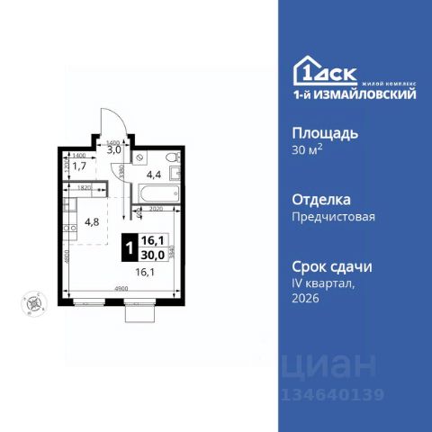 УСПЕЙ ПО СЕМЕЙНОЙ ИПОТЕКЕ БЕЗ НАЦЕНКИ! Квартиры в Москве от 46 000 рублей в месяц! Прямая продажа от застройщика! Жилой Комплекс Комфорт класса. Продаётся квартира-студия номер 713 общей площадью 30 кв.м. на 15-м этаже 15 этажного здания. Отделка Whitebox. Цена с учётом скидки. Особенности квартиры: - Линейная планировка - максимальная функциональность и удобство. - Увеличенное количество окон - дополнительное освещение и свежий воздух. - Гибкая планировка - создайте пространство по своему вкусу. - Место для игры/занятия спортом - идеальное пространство для активных детей. - Увеличенная высота потолков - ощущение простора и легкости. - Можно оборудовать рабочее место - комфорт для работы и учёбы. - Гардеробная - удобство для хранения и организации вещей. - Ниша под шкаф - компактное и удобное место для вещей. Квартира с предчистовой отделкой (White box). Вам не придется заниматься черновыми и трудоёмкими работы, а чистовую отделку и дизайн - сделайте на свой вкус. Информация о комплексе: Современный архитектурный проект "1-й Измайловский" - идеальное место для проживания, расположенное в восточной части Москвы в окружении 14 000 гектаров леса. Комплекс пронизан атмосферой здорового образа жизни и благополучия. Сиреневый сад и близлежащие лесопарки - это места, где можно насладиться лыжными прогулками зимой и тонизирующими пробежками летом. Расположенный между Щелковским шоссе и Амурской улицей, "1-й Измайловский" осмысляет себя не столько через близость к городским точкам притяжения, сколько через соседство с зелеными пространствами и спортивными объектами. Он отгорожен от шоссе застройкой первой линии и собственными садами здоровья. В его окнах - изумрудное море парка "Лосиный остров" и густые кроны окрестных дворов. В его графике - занятия спортом и прогулки в Измайлове. Транспортная доступность: Не более 2,5 км до станций метро "Щёлковская" и "Черкизовская" и МЦК "Локомотив". Щёлковское шоссе соединяет квартал с Северо-восточной хордой и МКАД, Центральным автовокзалом и Восточным железнодорожным вокзалом. Две автобусные остановки в паре минут ходьбы и 11 маршрутов общественного транспорта. На автомобиле 3 минуты до СВХ 12 минут до ТТК 15 минут до Садового кольца Внутренняя инфраструктура: Комплекс находится в исторически сложившемся районе Москвы с хорошим качеством и плотностью инфраструктуры. Торговые центры и сетевые магазины -6 детских садов, включая собственный детский сад на 125 мест -3 школы, включая собственную школу -Поликлиники и медицинские центры -Парки и зоны отдыха Расположение архитектурного проекта создает все условия для тех, кто стремится к здоровому образу жизни и для тех, кто уже сделал выбор в его пользу. В ближайшем окружении расположены несколько стадионов и множество спортивных объектов для занятий спортом на любой вкус: от всеми любимого футбола, баскетбола и до конного спорта. В окружении проекта более 30 километров организованных беговых и велодорожек.