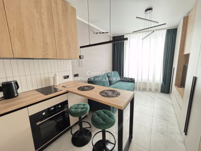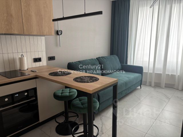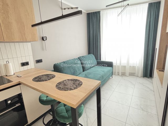 Студия с дизайнерским ремонтом в современном доме бизнес-класса полностью меблирована и оснащена техникой — можно сразу заехать и жить.