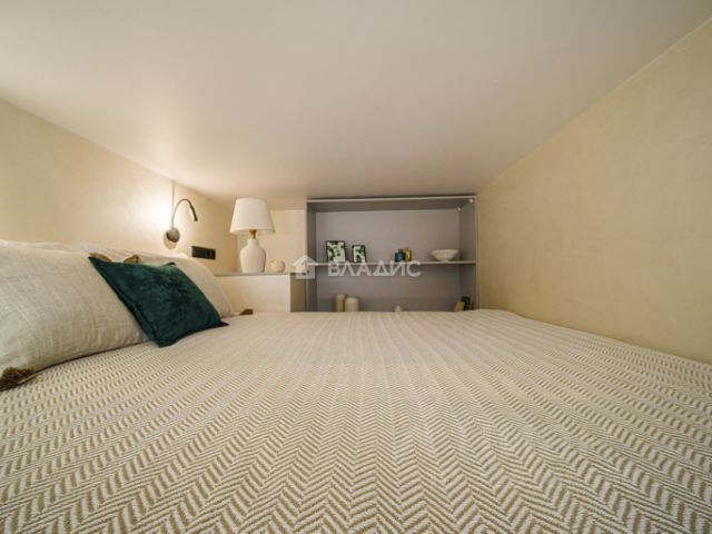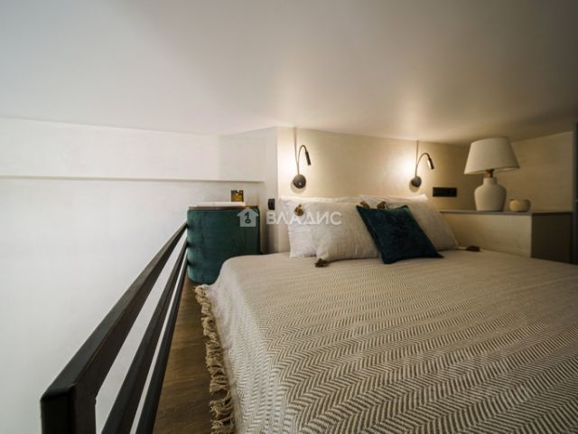 Общая площадь студии составляет 21,3 кв.м: первый уровень 15,9 кв.м, второй уровень 5,4 кв.м. Высота потолков 3,2 метра.