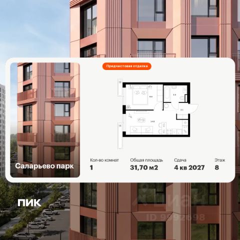 Продаётся 1-комн. квартира площадью 31,7 кв.м на 12 этаже 16 этажного дома (Корпус 57.4, Секция 4) проекта ПИК Саларьево парк. Светлый просторный подъезд на уровне земли, функциональная планировка, большие окна, предчистовая отделка.