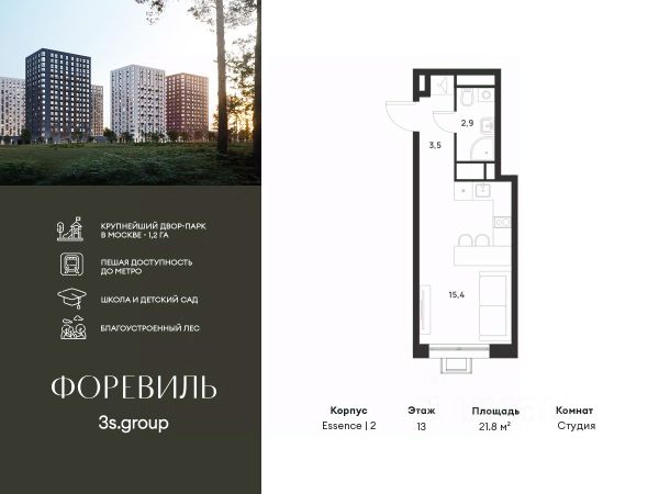 Предчистовая отделка в подарок! Пешая доступность от метро и московская прописка! Продается уютная 1-комн. квартира площадью 24,8 кв.м на 11 этаже 17 этажного жилого комплекса бизнес-класса Foreville от 3S Group. Общая площадь: 24,8 кв.м., жилая: 11,6 кв.м., площадь кухни-гостиной: 5,9 кв.м., высота потолков: 2,72 м., окна выходят на улицу. [1] Квартира предлагается без отделки, что идеально подходит для воплощения собственного дизайнерского решения. Также доступна опция предчистовой отделки, стоимость которой включается в общую цену квартиры. О проекте: Пространство Комплекс располагает крупнейшим приватным двор-парком в Новой Москве площадью 1,2 Га, предлагая жителям огромное пространство для отдыха, спорта и игр на свежем воздухе. Природный ландшафт Внутренний лесопарк с более чем 183 взрослыми деревьями и 10 320 цветущими кустарниками создает уникальную природную атмосферу для каждого времени года. Игровые и спортивные зоны Обширные площадки с безопасным покрытием, специализированные зоны для детей разных возрастных групп и взрослых, включая воркаут и настольный теннис, способствуют активному и здоровому образу жизни. Экологичность и долговечность Использование натуральных материалов, таких как лиственница, и крупноформатной бетонной плитки для покрытия, подчеркивает стремление проекта к экологичности и устойчивости. Безопасность и уединение Внутренний двор без машин обеспечивает безопасность для детей и спокойствие для взрослых. Территория огорожена и находится под круглосуточным видеонаблюдением. Сохранение времени Благодаря превосходной транспортной доступности и близости к новой станции метро Корниловская, Foreville позволяет жителям экономить время для семьи и отдыха на природе, минимизируя необходимость длительных поездок. Foreville не просто жилье, а целая экосистема для комфортной и гармоничной жизни на свежем воздухе, совмещая преимущества городской инфраструктуры и непосредственную близость к природе.