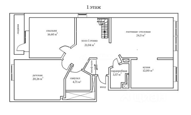 Пространство разделено на просторную залу с кухней на выделенном острове - возвышении, спальню с отдельной гардеробной комнатой, ванную комнату.