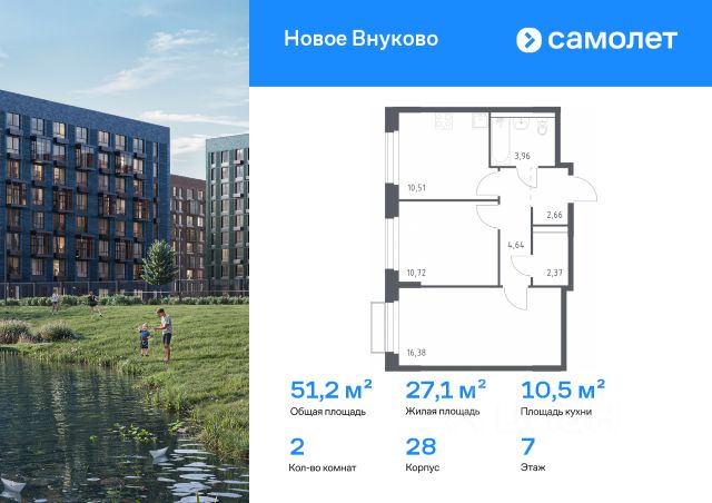 Строим кварталы для жизни с заботой о будущем. Предлагается 2-комнатная квартира комфорт-класса 53,94 кв.м в корпусе 28 на 5 этаже, в ЖК "Новое Внуково" Квартира без отделки. Доступность опции "отделка" и возможность комплектации мебелью и декором уточняйте у застройщика. Приобрести квартиру возможно по специальным акциям от застройщика, с текущими условиями акций можно ознакомиться в блоке "Акций". Цена динамическая и может отличаться, уточняйте актуальность у застройщика. "Новое Внуково" — это жилой комплекс в Новой Москве, у подножия берега реки Незнайка. Поблизости — живописные места для прогулок: народный парк "Ручеек", усадьба Старо-Никольское, Валуевский и Ульяновский лесопарки. Часть домов сдана и внутри района уже открыт детсад с бассейном, а в ближайшее время откроются еще 3 детсада, 2 школы и поликлиника. На территории проекта будет построен первый в России Центр Российской Федерации Баскетбола, где будут площадки с трибунами, тренажерный зал, кафе и конференц-зал. Дворы-парки закрыты от машин и посторонних. На территории — прогулочный маршрут вдоль реки Незнайка и набережная с шезлонгами и качелями для отдыха. Также здесь появится плейхаб "Незнайка на Луне", площадь для мероприятий с сухим фонтаном, летним кинотеатром и кафе. В жилом комплексе — монолитные дома высотой от 6 до 14 этажей. Фасады облицованы кирпичом природных оттенков.