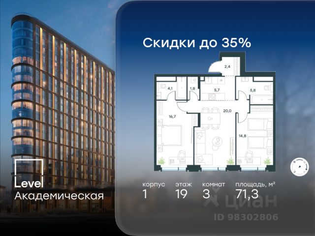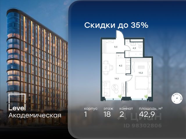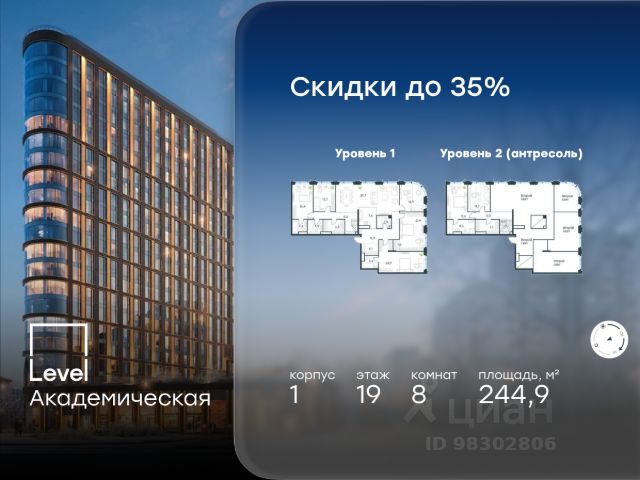 Цена указана с учётом скидки при 100%-й оплате, несубсидированной ипотеке, рассрочке (кроме программы "Рассрочка 0%"). В Академическом районе продаётся 2-комнатная квартира площадью 63.70 кв.м без отделки. Квартира расположена на 18-м этаже 19-этажного жилого комплекса бизнес-класса Level Академическая (компания Level Group). Отличная транспортная доступность: - 1 мин. пешком до станции метро "Академическая"; - 4 мин. на автомобиле до ТТК; - 8 мин. на автомобиле до Садового кольца; - 13 мин. на автомобиле до Кремля. Продуманный архитектурный проект: - современная архитектура от бюро UNK project; - высокие потолки в квартирах до 6,62 м; - окна в пол высотой 2,5-2,68 м с панорамным видом на МГУ, Москва-Сити и другие доминанты Москвы; - квартиры с моллированным остеклением - радиусные окна открывают увеличенный угол обзора; - более 20 вариантов планировочных решений; - уникальные квартиры с собственным патио и возможностью обустройства дровяного камина; - квартиры сдаются без отделки, что открывает свободу для создания интерьера по своему вкусу. Расположение: Камерный проект из 1 корпуса расположен тихом зеленом районе Москвы, в непосредственной близости к центру города. В округе построено 80 детских садов, 50 школ и 30 вузов, 7 из которых входят в топ100 вузов России: МГУ, МГИМО, РАНХиГС, МИСИС, РУДН, РЭУ им. Плеханова и РГУ нефти и газа им. Губкина. Этот район буквально утопает в зелени парков, начиная с уютного Академического в 6 минутах пешком и заканчивая одним из крупнейших в городе парком 50-летия Октября (12 минут на автомобиле). Общая площадь природных объектов в радиусе 2-6 км от дома - 476,5 га. Внутренняя инфраструктура: На территории Level Академическая откроется собственный торговый центр, а для отдыха жителей будут созданы общественные пространства: комфортное лобби с дизайнерской отделкой, окнами в пол и потолками высотой 4,5 м, а также две благоустроенные зоны - территория по периметру здания и пространство на стилобате. Во дворе на стилобате предусмотрены детская и спортивная площадки, коворкинг и лаунж-зона на открытом воздухе. Стилобат украсят скульптуры животных - жирафа, зайца и волка, которые станут ярким акцентом внутреннего двора Level Академическая, подчеркивая близость к музею Дарвина. Процент озеленения территории - 58%. Технологии и безопасность: Жителей Level Академическая не коснется ежегодное отключение горячей воды благодаря собственным центральным водонагревателям. Безопасность гарантирует круглосуточная охрана, безлимитный Wi-Fi, круглосуточное видеонаблюдение. Удобное перемещение внутри комплекса будут обеспечивать 5 лифтов с доступом в паркинг с жилых этажей. Квартира в районе Академический в Москве.