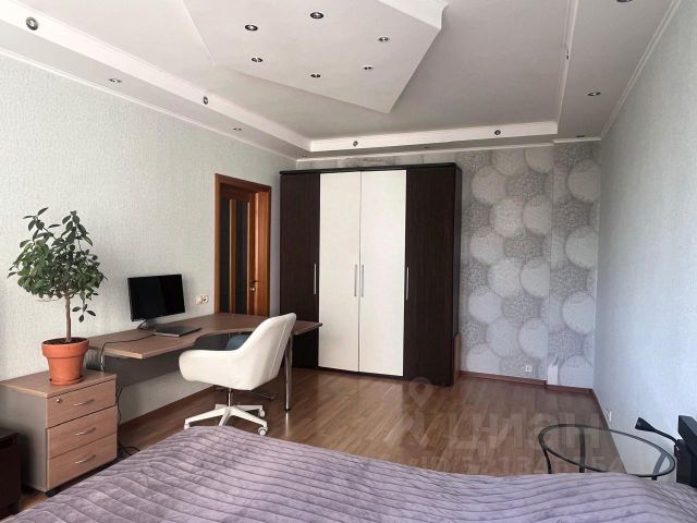 Большая спальная комната оборудована комфортно: кровать, телевизор Samsung, кондиционер Panasonic, шкаф. Организовано удобное рабочее место, регулируемая система потолочного освещения.