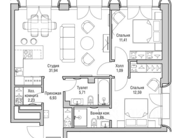 * объединённая кухня-гостиная;