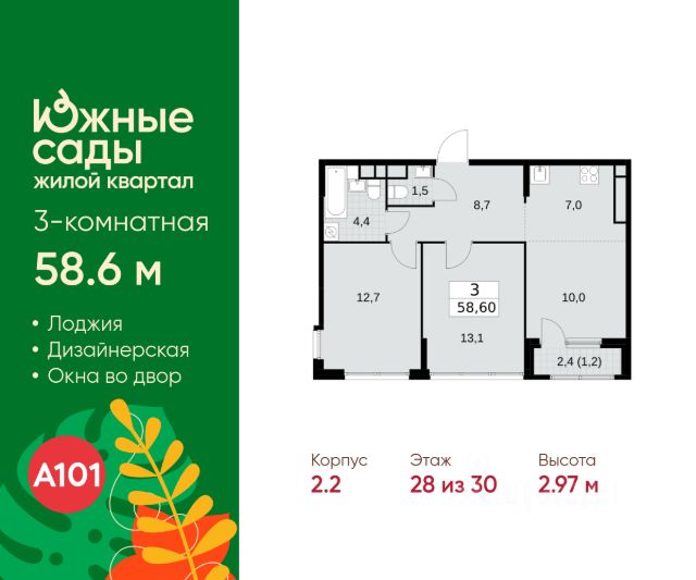 Продается трехкомнатная квартира 57 в новостройке ЖК "Южные Сады" по адресу Москва, ЮЗАО, Южное Бутово, Жилой комплекс "Южные Сады", корп. 2.1. Общая площадь квартиры - 101.30 кв. м., этаж 16 из 16, секция 1. Тип проекта, по которому построен дом - монолит, компания-застройщик - ООО "А101". Стоимость квартиры - 41314192 Р. "Южные сады" на юго-западе Москвы - это жилой комплекс монолитных домов с авторской архитектурой, холлами в средиземноморском стиле, колясочными, современными лифтами, паркингом и кладовыми. Южную атмосферу в районе создадут: - перголы с вьющимися растениями, живые изгороди, садовые дорожки - цветущие, плодовые и вечнозелёные растения - стилизация под средиземноморский ландшафт - амфитеатр и игровой кластер со скалодромом. За безопасность "отвечают" закрытые дворы без машин с доступом только для жителей дома, видеонаблюдение, вход по магнитным ключам. Рядом ландшафтный парк "Южное Бутово", Черневские пруды: театры, танцплощадка, крытые беседки, детские и спортивные комплексы, пикниковые зоны, пешеходные дорожки, деревянные настилы. На первых этажах домов: супермаркеты, кафе, банки, фитнес, пекарни. В пешей доступности - торговые центры, гипермаркет, ФОК, действующая инфраструктура. Для семей с детьми - кружки, секции, детские клубы,центры развития, языковые школы. Преимущества "Южных садов": - атмосферное "средиземноморское" благоустройство - 3 станции метро: "Бунинская аллея", "Улица Горчакова", "Новомосковская" - в пределах 1,6 км - в окружении - развитая инфраструктура обжитой локации - в пешей доступности - Бутовский лесопарк Квартира на улице Бартеневская в Москве.
