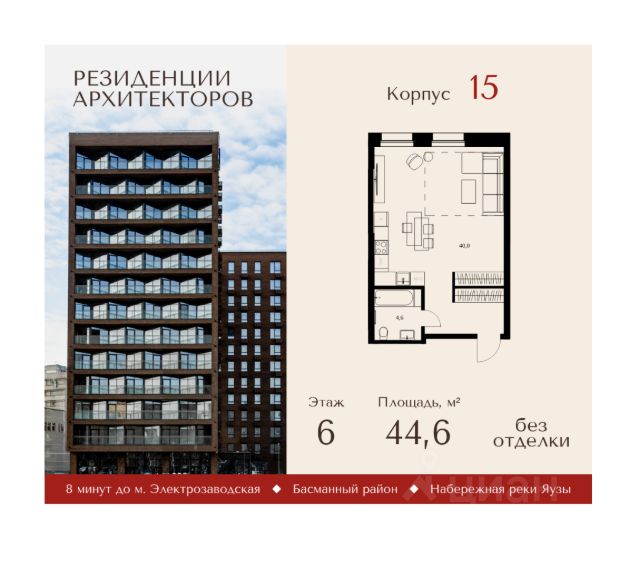 СКИДКИ ДО 44%! Продаются просторные 1-комнатные апартаменты общей площадью 39,5 м² на 2 этаже в сданном жилом квартале "Резиденции Архитекторов" вблизи с метро Электрозаводская и БКЛ Электрозаводская. Жилой квартал "Резиденции архитекторов" - удобный и тщательно продуманный проект для тех, кто ценит высокий уровень качества жизни. Подземный отапливаемый паркинг, разнообразная инфраструктура на первых этажах, малые архитектурные формы, ландшафтный дизайн и собственный пешеходный бульвар - здесь есть всё для яркой и комфортной жизни, работы, творчества и воспитания детей. Проект выполнен в едином принципе геометрии, ритма, сочетания чистых фактур и материалов. Символом бульвара является необычная площадь с большим светопрозрачным навесом, на котором изображена карта Москвы. Планировочные решения "Резиденции архитекторов" — это гордость проекта. Высокие потолки, хорошая инсталляция, панорамные окна, все перечисленное обеспечивает высокий уровень комфорта вне зависимости от площади и этажности.