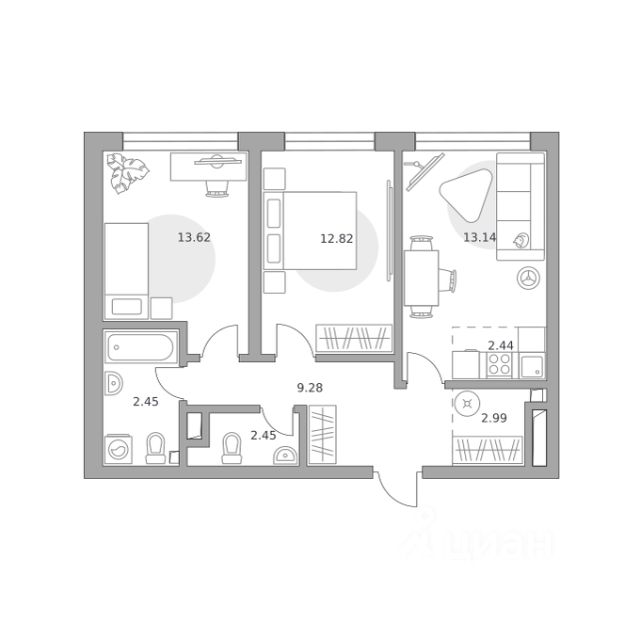 Продаётся 3-комнатная квартира 537, площадью 62,45 м², на 27 этаже в ЖК "Тринити" корпус 1. Стоимость — от 22317391 руб. Квартира без отделки, планировка односторонняя, окна на улицу.