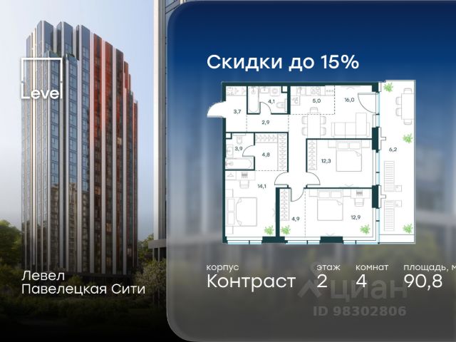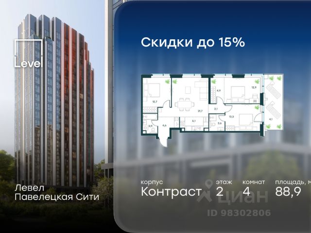 Цена указана с учётом скидки при 100%-й оплате, несубсидированной ипотеке, рассрочке (кроме программы "Рассрочка 0%"). В Даниловском районе столицы (ЮАО) продаётся 2-комнатная квартира площадью 44.20 кв.м без отделки. Квартира расположена на 4 этаже 27-этажного корпуса 14 в жилом комплексе бизнес-класса Левел Павелецкая Сити. Высота потолков 3.00м. Престижная локация Жилой комплекс бизнес-класса Левел Павелецкая Сити расположен в престижном Даниловском районе Москвы - историческом центре города в окружении парков, Москвы-реки и новейшей инфраструктуры. В 20 минутах пешком есть 3 станции метро, а в 5 минутах езды на авто - ТТК и Садовое кольцо. - 15 мин. пешком до метро "Павелецкая"; - 20 мин. пешком до станций "Тульская" и "Серпуховская"; - 8 мин. на авто до Кремля; - 10 мин. на авто до парка Горького и парка "Зарядье"; - 20 мин. на авто до башен "Москва-Сити". Авторская архитектура Авторская архитектура Авторская архитектурная концепция разработана бюро СПИЧ. Облик корпусов этапов 1 и 2 отсылает к стилистике архитектуры классического Нью-Йорка и золотой эпохи Голливуда. Корпуса этапа 4 вдохновлены эстетикой ар-деко. Умное линейное расположение корпусов гарантирует потрясающие виды на исторический центр и Москву-реку из большинства квартир. Дизайнерские лобби Изысканные интерьеры лобби жилого комплекса отсылают к классическим фильмам золотой эпохи Голливуда. Классика в жилом комплексе Левел Павелецкая Сити - не имитация, а современное осмысление лучшего в этом стиле. В каждом вестибюле оборудованы стойки ресепшен, комфортные зоны ожидания, гостевые санузлы, мойки для лап животных, колясочные. В корпусах по 3-4 лифта с прямым доступом в паркинг. Площадь лобби - от 47,9 до 114,9 кв. м, высота потолков - до 5,46 м. Благоустройство и инфраструктура Для создания благоустройства было приглашено 2 ведущих бюро - ADM и GAFA. Разноуровневое пространство вмещает в себя игровые площадки для детей всех возрастов, тропы здоровья для пеших прогулок, крытые аллеи с качелями, места для работы на свежем воздухе, многофункциональные спортивные площадки - зоны уличных тренировок, столы для пинг-понга, зоны командных игр. Общая площадь закрытого двора - 4,63 га. Комфорт - это когда рядом всё, что нужно для жизни. В жилом комплексе Левел Павелецкая Сити размещены 85 коммерческих помещений, где откроются супермаркеты, кафе, аптеки и многое другое. В составе проекта также предусмотрены собственный фитнес-клуб, развивающий центр Летово Кидс. Технологии и безопасность - Вайфай в лобби и на придомовой территории; - Автоматизированная система контроля и учета ресурсов; - Круглосуточное видеонаблюдение и охрана; - Круглосуточная связь с охраной через приложение, телефон или кол-центр; - Контроль доступа по биометрической системе распознавания лица; - Усиленный сотовый сигнал в лифтах и паркинге; - Распознавание номеров автомобилей при въезде/выезде в/из паркинга.