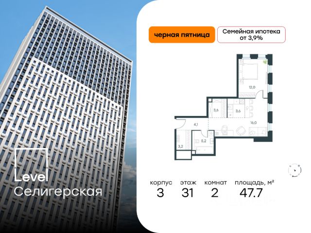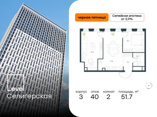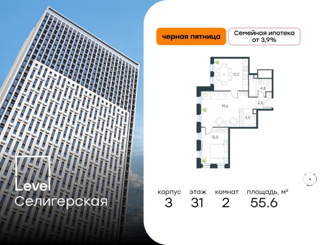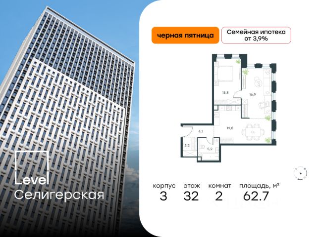 Цена указана с учётом скидки при 100%-й оплате, несубсидированной ипотеке, рассрочке (кроме программы "Рассрочка 0%"). Субсидированная семейная ипотека. Полная стоимость кредита 20,963 - 23,237% годовых. Ставка 3,9% годовых. Первоначальный взнос от 20,01%. Сумма кредита до 12 млн. руб. В жилом квартале, расположенном в южной части района Западное Дегунино, продаётся 2-комнатная квартира площадью 42.70 кв.м без отделки. Квартира расположена на 7 этаже 40-этажного корпуса Корпус 3 в жилом комплексе комфорт-класса Level Селигерская (компания Level Group/Левел групп). Отличная транспортная доступность: - 10 мин. пешком до станции метро "Селигерская" от корпусов 1-й очереди; - 10 мин. пешком до станции метро "Верхние Лихоборы" от корпусов 2-й очереди; - 20 мин. пешком до станции МЦД-3 "Моссельмаш"; - 11 мин. на авто до МКАД; - 13 мин. на авто до ТТК; - 16 мин. на авто до Садового кольца. Расположение Район отличается богатой социальной инфраструктурой: школы, детские сады, поликлиники, магазины, фитнес-клубы, торговые центры - всё близко к дому. Рядом с Level Селигерская расположено 5 парковых зон. В 3 минутах от дома расположен перспективный сквер-парк. В 10 минутах пешком находится парк им. Святослава Фёдорова, в 13 минутах на велосипеде - парк "Ангарские пруды". В 7-11 минутах на автомобиле - два крупных природных объекта: Тимирязевский парк и Главный ботанический сад Российской академии наук. Благоустройство Внутренние дворы жилого комплекса огорожены от машин, а их функциональное наполнение отличается в зависимости от очереди строительства. На территории 1-й очереди будут: детская площадка, воркаут-зона, места для тихого отдыха и активных игр, а также сенсорный сад и большой луг. Во 2-й очереди жителей ждут уютные навесы с качелями, павильон-читальня, волейбольная площадка, беседки, а также детские и спортивные площадки. Технологии и инженерия Для входа на территорию комплекса предусмотрен единый ключ доступа. Все общественные зоны оснащены камерами видеонаблюдения, по заявке собственнику предоставляется возможность просмотра изображения отдельных видеокамер на его мобильном устройстве. При въезде в паркинг функционирует система распознавания госномеров. Кроме того, для комфорта жителей создано мобильное приложение, с помощью которого можно удаленно контролировать доступ на придомовую и жилую территории. Другие преимущества жилого комплекса - Высокая освещенность квартир: в большинстве из них не меньше трёх окон; - Супермаркет, магазины, кафе, пекарни и многое другое на первых этажах домов; - Частный детский сад; - Стильные дизайнерские лобби с высокими потолками до 4,9 м и окнами в пол, для питомцев предусмотрена лапомойка; - 20+ планировочных решений: от студий до семейных квартир; - С каждого этажа дома на лифте можно спуститься в подземный отапливаемый паркинг.