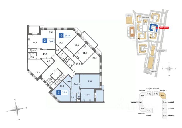 Продаётся 3-комнатная квартира в сданном доме (Семёна Гордого, 1), срок сдачи: III-кв. 2018, общей площадью 95.3 кв.м., на 4 этаже. Расположение, транспортная доступность Жилой комплекс "Ново-Никольское" - это жилой район класса комфорт, в состав которого входят несколько десятков жилых зданий разнообразных форматов (коттеджи, дуплексы, таунхаусы, малоэтажные дома высотой до 3 этажей и многоэтажные корпуса высотой до 9 этажей). Район располагается на просторной территории площадью 115 га рядом с деревней Ивановское Первомайского поселения Троицкого административного округа Москвы, в 21 км от МКАД по Киевскому шоссе. Удобная транспортная развязка, ведущая к шоссе, находится в непосредственной близости от "Ново-Никольского". Трасса пролегает мимо аэропорта "Внуково". Ближайшая железнодорожная станция, "Апрелевка", расположена в десяти километрах от комплекса. Добраться от комплекса до ближайших станций метро можно на маршрутном такси 304 (до станций метро "Румянцево", "Тропарёво" и "Юго-Западная"), на автобусе 526 или маршрутном такси 522 (до станции метро "Тёплый Стан"). Инфраструктура Внутренняя инфраструктура ЖК "Ново-Никольское" включает в себя три детских сада на 150, 100 и 40 мест, две общеобразовательные школы на 825 и 285 мест, школу искусств, торгово-развлекательный центр, минимаркет, различные сервисные службы и другие объекты. Детский сад на 150 мест и школа на 825 мест уже построены и в ближайшее время будут введены в эксплуатацию. Для автовладельцев в комплексе предусмотрены парковочные места, как на придомовой территории, так и в крытом семиуровневом паркинге. Экологическая ситуация здесь благоприятная. Со стороны Киевского шоссе "Ново-Никольское" окружают лесные массивы. Река Десна, протекающая вдоль территории жилого комплекса, украшена живописным каскадом прудов. В километре от комплекса находится усадьба Старо-Никольское, главный дом которой был построен в 19 веке, и отреставрирован в 2015 году. Надежность застройщика Девелопером жилого комплекса "Ново-Никольский" выступает производственно-строительное управление "АГРОСТРОЙ", зарегистрированное в 2005 году. Организация работает как в России, так и в странах ближнего зарубежья. "АГРОСТРОЙ" возводит не только жилую недвижимость, но и социально-значимые объекты инфраструктуры: медицинские центры, торгово-развлекательные комплексы, административные здания. Также в портфеле организации есть спортивные сооружения крытого и открытого типов. При возведении жилых комплексов девелопер ориентируется на строительство целых кварталов с развитой инфраструктурой. Помимо строительных работ, "АГРОСТРОЙ" производит отделочные, комплектующие, строительные материалы, осуществляет земляные работы, занимается прокладкой наружных сетей, разводкой коммуникаций внутри зданий, а также сносом ветхого жилья. Поскольку объекты организация сдаёт "под ключ", она также выполняет отделочные работы и ландшафтное оформление придомовых территорий. Архитектура В комплексе есть все необходимые центра
