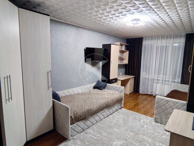 3. 1я комната - есть все для работы, отдыха и приема гостей: большая кровать из массива дерева, письменный стол и табуретка, три шкафа, два кресла и журнальный столик с зеркальной поверхностью, зеркало в полный рост и напольная вешалка для одежды.
