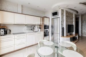 - Просторная гостиная-столовая с бамбуковым паркетом, кухня. Мебель немецкого производства, техника премиум сегмента.