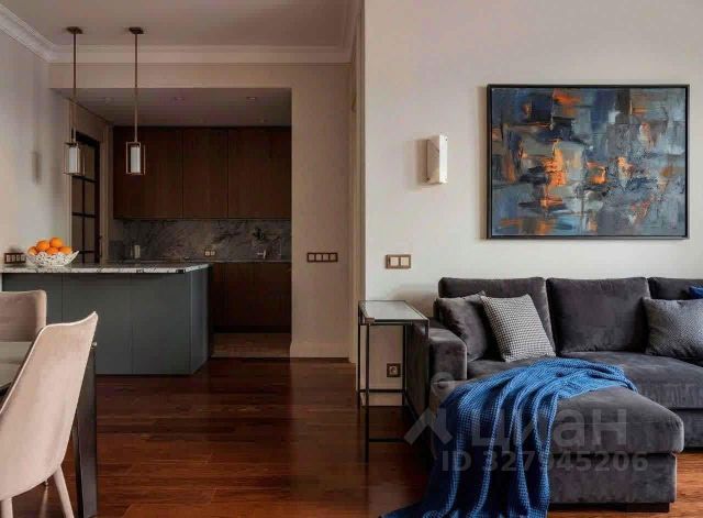 Премиальная отделка создает атмосферу уюта и элегантности, подчеркнутую высокими потолками и панорамными окнами.