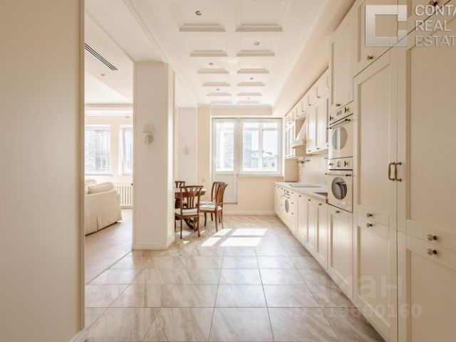 В квартире большая кухня-гостиная 60 м2 с дорогой кухней из шпона и эмали, сделанной под заказ именно для этой квартиры. Кухня полностью укомплектована техникой Miele, Asko. Из кухни есть выход на большую застекленную лоджию.