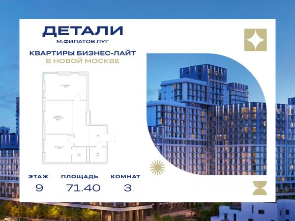 ЖК "Детали" | 2-комнатная квартира, 52.20 м², 5-й этаж. Светлая квартира с панорамным остеклением на высоком этаже. Благодаря продуманной ступенчатой застройке и панорамному остеклению квартиры здесь получают максимум естественного освещения в течение дня. Продуманная планировка создает ощущение простора и уюта. В комплексе — закрытая территория, подземный паркинг и развитая инфраструктура. Легкость передвижений: до метро "Филатов Луг" всего 15 минут на комфортном автобусе, который отправляется от самого дома. В 2027 году в 10 минутах от проекта откроется станция "Десна" Троицкой линии метро. Комфорт и безопасность: - Подземный охраняемый паркинг, оснащенный системой считывания номеров, с доступом на лифте с любого этажа - Наземный паркинг с зарядкой для электрокаров - Безопасная закрытая территория без машин под охраной и видеонаблюдением с системой контроля и управления доступом - Безбарьерная среда с многоуровневым ландшафтным парком, детскими площадками, зонами для отдыха и арт-объектами Сервисы рядом: фитнес, коворкинг, детский клуб Дом расположен в центре поселка Марьино, поселение Филимонковское Новой Москвы. Это место, где рады семьям. Рядом уже работают детский сад и школа, а к 2027 году прямо на территории откроются еще два новых садика В 100 метрах — природный парк "Марьино" и река Незнайка. Этот район признан одним из самых экологически благоприятных в Москве по данным рейтинга EcoStandart Group. На территории ЖК девелопер реализует: - Два собственных детских сада по 250 мест (в 4-м квартале 2026 года, в 1-м квартале 2027 года) - В каждом лобби — общественный санузел, мягкая зона ожидания, отдельные помещения для хранения колясок, велосипедов и самокатов, а также помещения для мойки лап собакам Для покупки вы можете рассмотреть варианты: - Все виды ипотеки, включая семейную и военную - Использование материнского капитала - Trade-in - Индивидуальные скидки от застройщика Свяжитесь с нами, чтобы назначить встречу в офисе продаж. Убедитесь в преимуществах жизни в ЖК "Детали" лично. Наши менеджеры подробно ответят на все ваши вопросы.