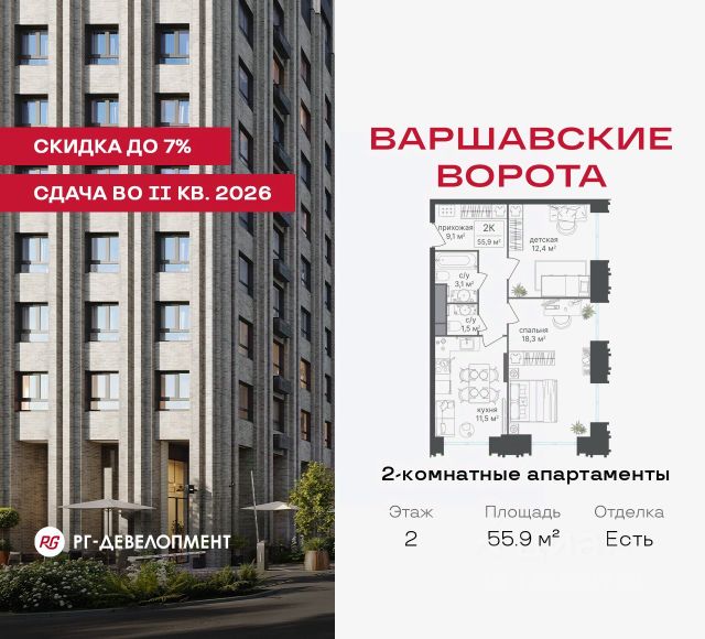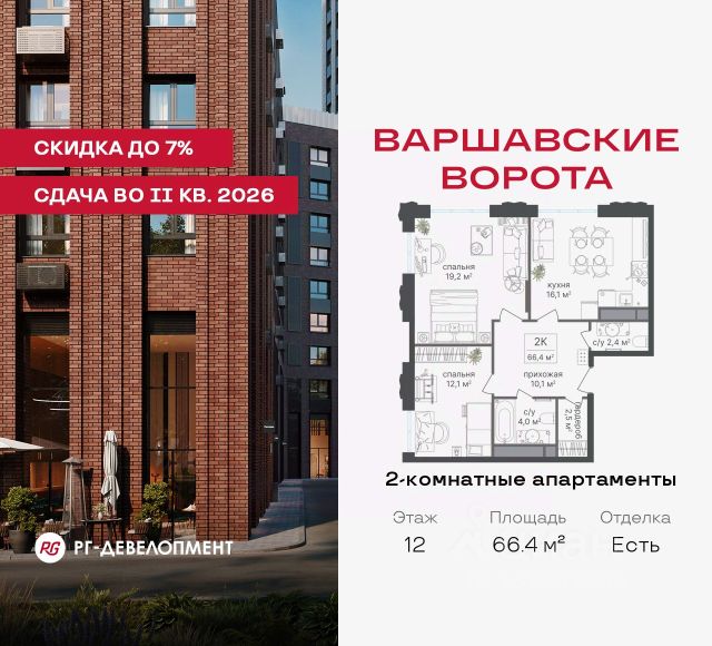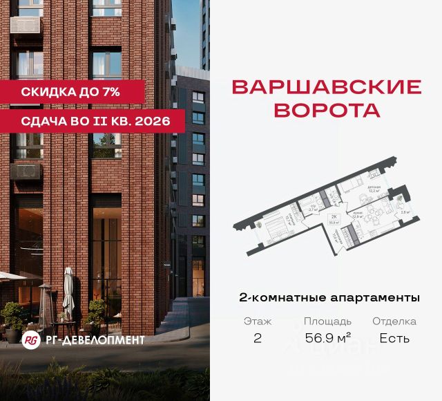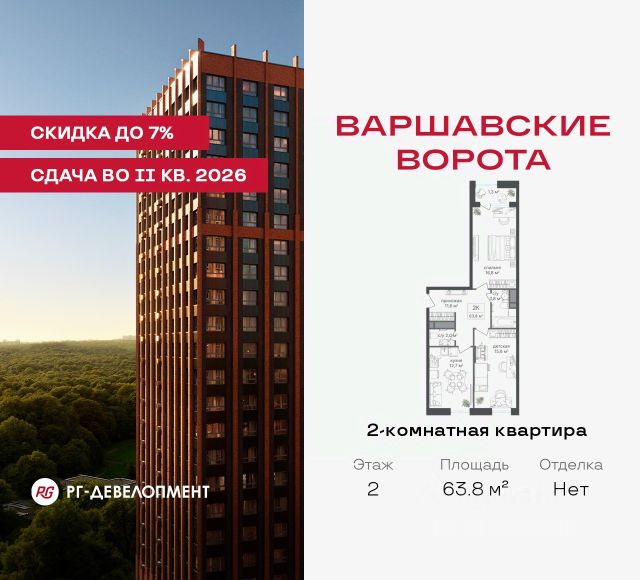 Рассрочка 0% + скидка 5%. Первый взнос 20%, второй — через 6 мес., остаток —до ввода. Продаются 2-комнатные апартаменты 54.3 кв.м. в МФК "Варшавские ворота" на 4-м этаже 9 этажного дома. МФК "Варшавские ворота" — это точка баланса между природой и городом, стилем и функциональностью, жизнью сегодня и устойчивым будущим. Коротко о важном: - 1 минута пешком от м. Аннино; - Удобные выезды на Варшавское шоссе и МКАД; - Высота потолков 2,7 - 3 м; - Закрытый двор-парк; - Школы и детские сады в 10-15 минутах пешком от дома; - Технические лоджии для размещения кондиционеров; - Подземный паркинг; - РГ-Девелопмент — ТОП-20 крупнейших застройщиков Москвы. Проект сочетает в себе современную архитектуру и продуманное благоустройство с уникальным природным окружением. Всего в нескольких минутах от дома — девять парков, каскад прудов и крупнейшие лесопарковые зоны Москвы, создающие ощущение жизни в зеленом оазисе посреди мегаполиса. Архитектурная концепция - стиль Чикаго в Москве. Фасады облицованы вентфасадами под клинкерную плитку. Фасады подчеркивают строгие линии и современный стиль, а входные группы разработаны московским бюро Синтаксис. Вестибюли оформлены с применением керамогранита, декоративной штукатурки и гипсовых панелей, детали из латуни добавляют изысканности. Проект находится в 1 минуте пешком от метро "Аннино", в 12 минутах от станции "Улица Академика Янгеля" и рядом с МЦД-2 "Красный Строитель". Для автомобилистов предусмотрен прямой выезд на Варшавское шоссе и два съезда на МКАД, что позволяет быстро добираться в любую часть города. Среди планировочных решений представлены разнообразные форматы: от функциональных студий до просторных 4-комнатных квартир и апартаментов. Высокие потолки усиливают ощущение простора, а продуманные планировки включают мастер-спальни, гардеробные, объединённые кухни-гостиные и несколько санузлов. Центральное пространство комплекса — закрытый двор без машин. Он разделён на функциональные зоны: детские игровые комплексы, спортивные площадки и уютные места для тихого отдыха. На первых этажах разместятся магазины, кафе и сервисы, что позволит решать повседневные задачи, не покидая территорию комплекса. Для семей с детьми предусмотрен частный детский сад на 50 мест. Подземная парковка и кладовые обеспечат удобство хранения и безопасность автомобилей. Комплекс окружён девятью парками и лесопарками, каждый из которых обладает своей атмосферой. Выйти на пробежку в Аннинском лесопарке, насладиться прогулками по аллеям в Битцевском лесу, спланировать пикник или велопрогулку в Покровском парке, любоваться каскадом Кировоградских прудов. Всего в двух станциях — музей-заповедник "Царицыно" с дворцами, фонтанами и живописными пейзажами. Здесь каждый житель найдёт своё любимое место для отдыха. Южное Чертаново - район развитой инфраструктурой, где сочетаются городские удобства и природное окружение. В шаговой доступности находятся школы, детские сады, спортивные комплексы и торговые центр