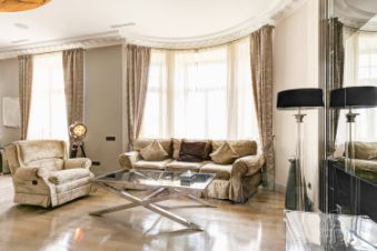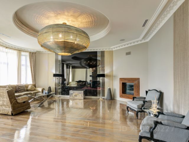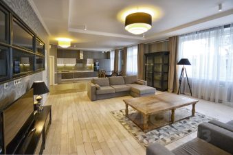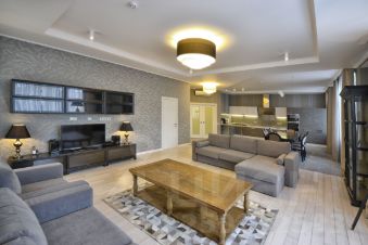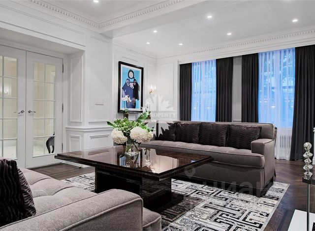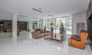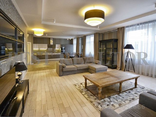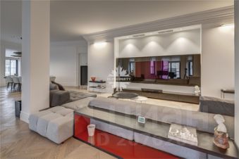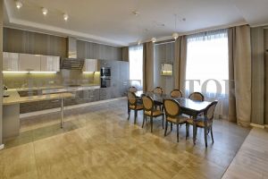 В квартире осуществлён эксклюзивный евроремонт в современном классическом стиле с применением дорогостоящих отделочных материалов. На полу настелен дубовый паркет, стены и потолки идеально выровнены и окрашены, оклеены обоями, нанесена художественная штукатурка. Квартира полностью меблирована и оснащена встроенной кухней, комплектом бытовой техники от ведущих мировых производителей, встроенными шкафами-купе, современными стеклопакетами, кондиционерами, биметаллическими радиаторами, металлической входной дверью, сигнализацией. В квартире две просторные ванные комнаты и гостевой туалет. Санузлы оснащены надёжной сантехникой, ванной, тёплыми полами, бойлером. 2 гардеробные комнаты.