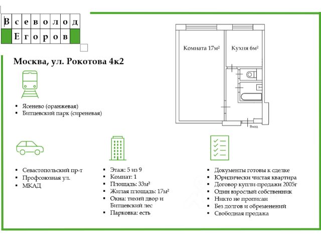 Один взрослый собственник, свободная продажа.